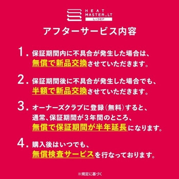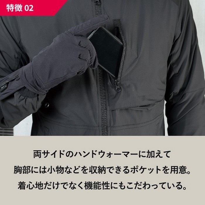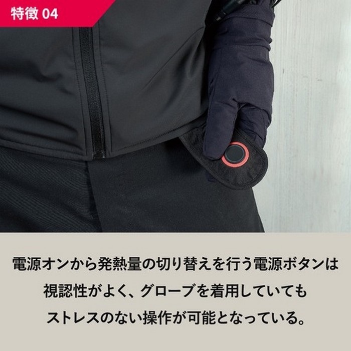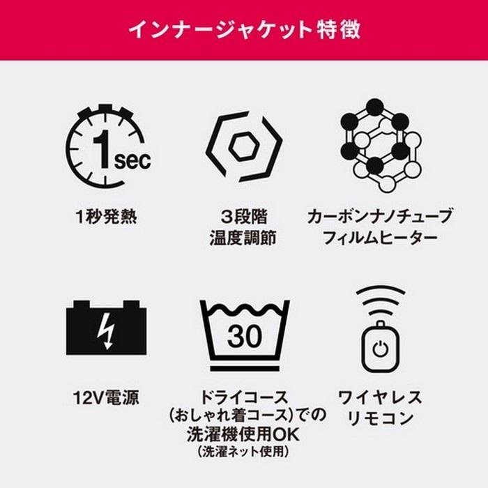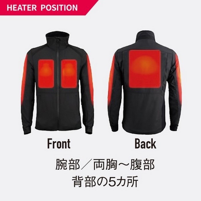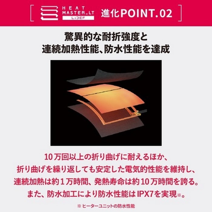 ヒーターの電極・コネクタ・温度センサーなどに防水加工を施しており、防水性能は国際規格( I E C60529)IPX7を取得。(一時的「30分」に一定水深「1m」の条件に水没しても内部に浸水しない)かつ、耐折強度の高さから洗濯も可能(洗濯機によるドライコース)。