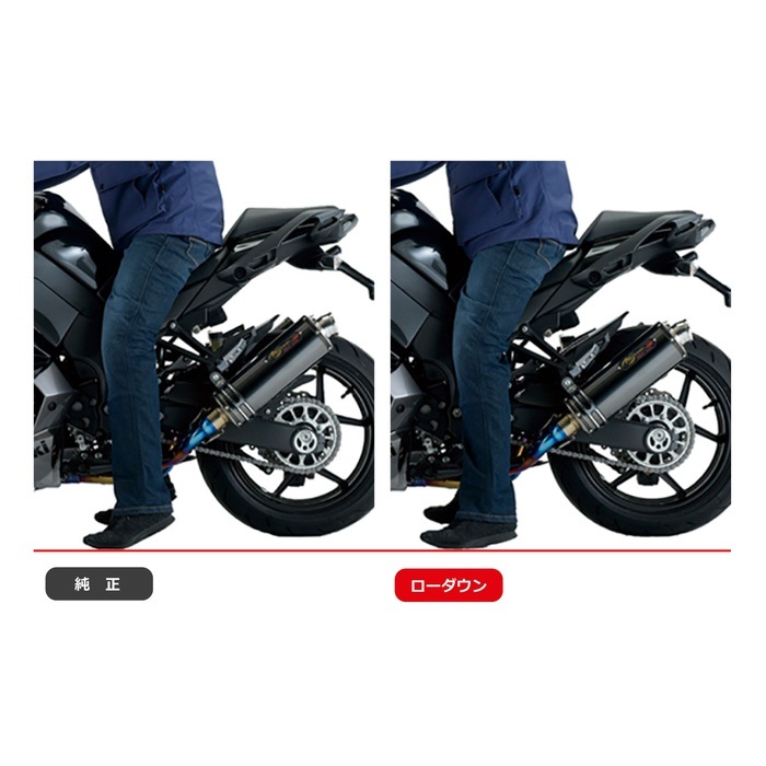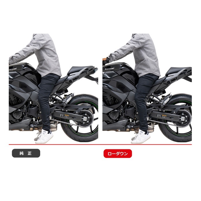 Ninja1100SX・Ninja1000SX・Ninja1000用の、エフェックスのローダウンキット。20mmダウンのローダウン量で、足つきを改善。全世界で販売される事を考えられた純正の車高は我々日本人にとっては少し高い。つま先が付くか付かないかの状態では、「信号待ち」や「一時停止」といった発進や停車時は緊張を余儀なくされます。EFFEXのローダウンキットを使い、ほんの少し車高を下げる事で大きな安心感を得る事ができます。足つき性が上がり、重心が下がる事で車体にまたがったままの移動や、車体を手で押し引きする際にもその効果を実感していただけるはずです。また、エフェックスのローダウンキットは車種毎に運動性能を損なわない適切なダウン量を設定することで、乗ってもしっかり楽しいバランスを実現。あなたのバイクライフをもっと楽しく、より充実したものにしてくれます。