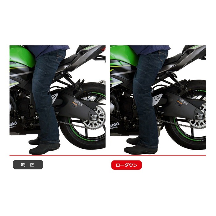 使用上の注意:ローダウンをさせることによって、ノーマルのサイドスタンドのままでの停車は、車体の傾きが起き気味になります。EFFEXショートサイドスタンドを併せてご装着下さい。また適合車両、適合年式以外の車両へのご使用はお止め下さい。