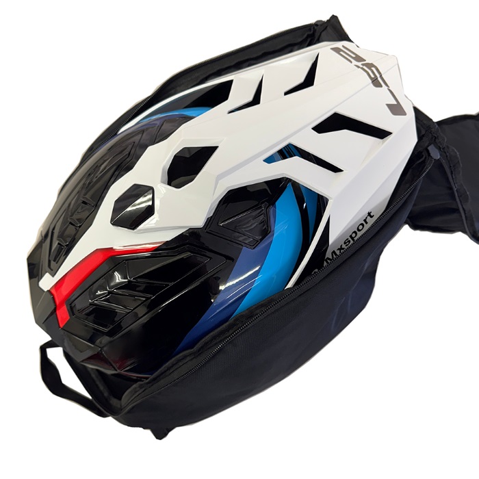 ヘルメットを収納し運べるバックパックです。フルフェイスはもちろん、オフロードヘルメットも収納できるモデルがございます。(例:LS2 EXPLORER Fが収納できます。その場合、バイザーを下向き方向に収納する必要があります。)ファスナー付ポケット、チェストバックルも備えています。