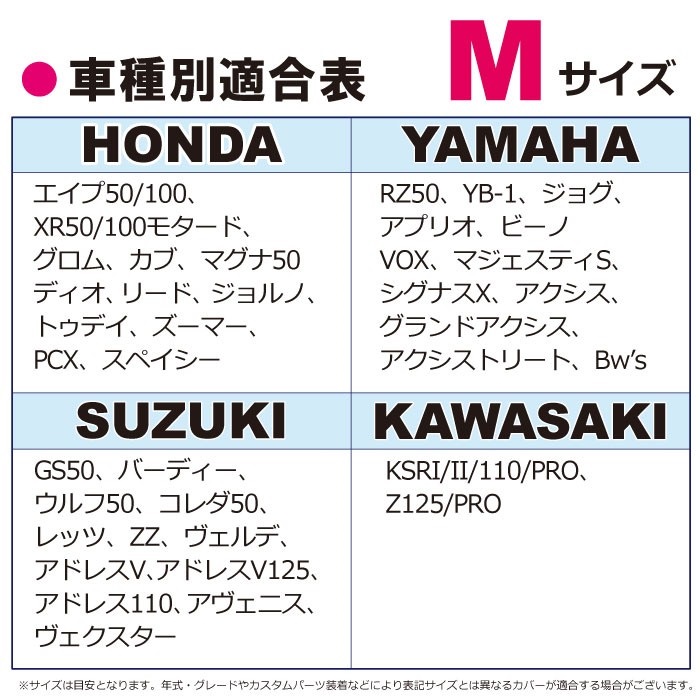 トップケースやカウル・スクリーンを装着した場合でも適合表記載のサイズにて使用が可能ですが、年式やグレード、仕向け地による仕様の違いや、カスタム状況により適合しない場合がございます。適合表は目安としてご利用ください。