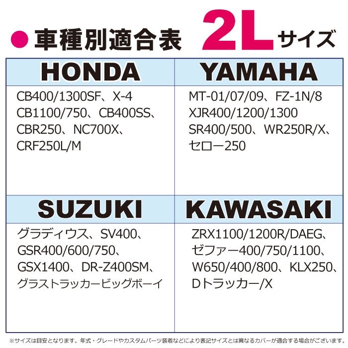 トップケースやカウル・スクリーンを装着した場合でも適合表記載のサイズにて使用が可能ですが、年式やグレード、仕向け地による仕様の違いや、カスタム状況により適合しない場合がございます。適合表は目安としてご利用ください。