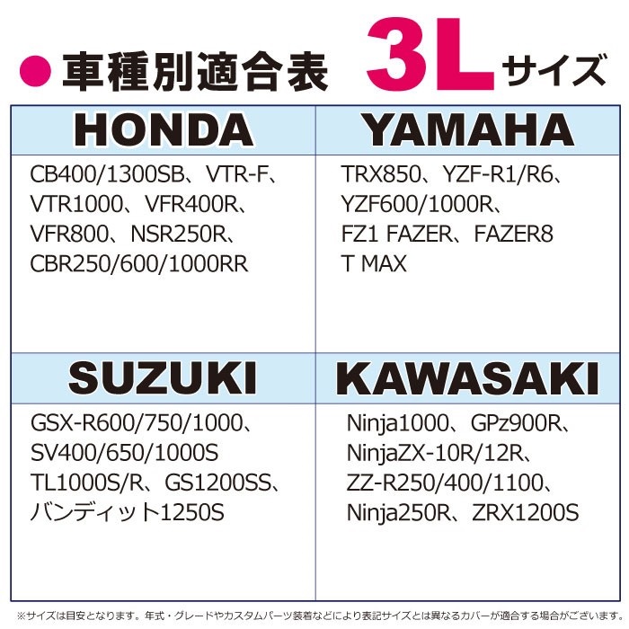 トップケースやカウル・スクリーンを装着した場合でも適合表記載のサイズにて使用が可能ですが、年式やグレード、仕向け地による仕様の違いや、カスタム状況により適合しない場合がございます。適合表は目安としてご利用ください。