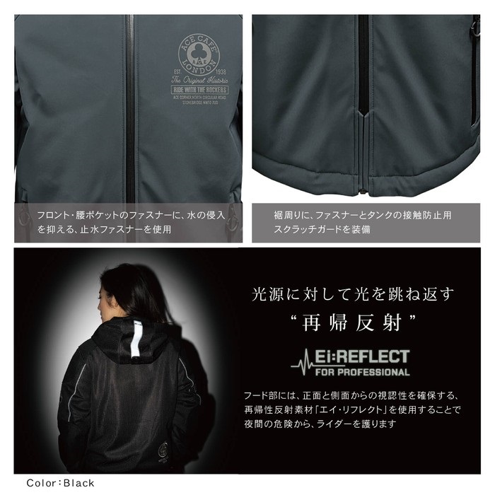 ・夜間走行時の視認性確保のため、フード部に再帰性反射素材「Ei REFRECT」を使用。広範囲の反射効果で、夜間の危険性からライダーを護ります。