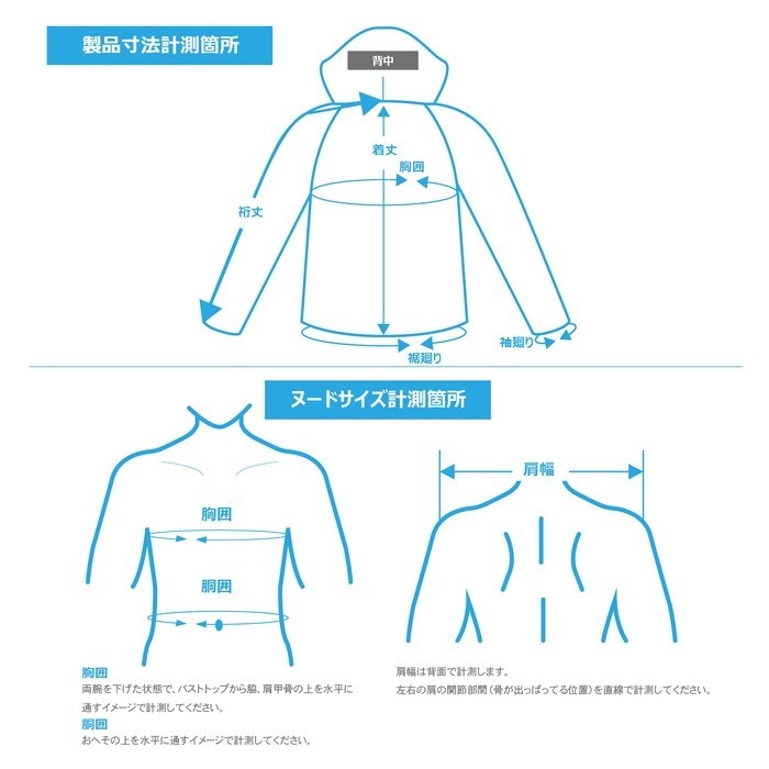 表地:ポリエステル(超撥水Ei コーティング仕様)+ 防風フィルム+中綿(SORONA AURA)