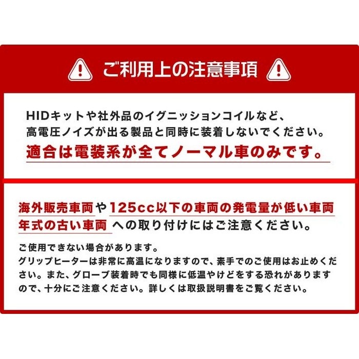 ●グリップヒーターは非常に高温になりますので、素手でのご使用はお止めください。