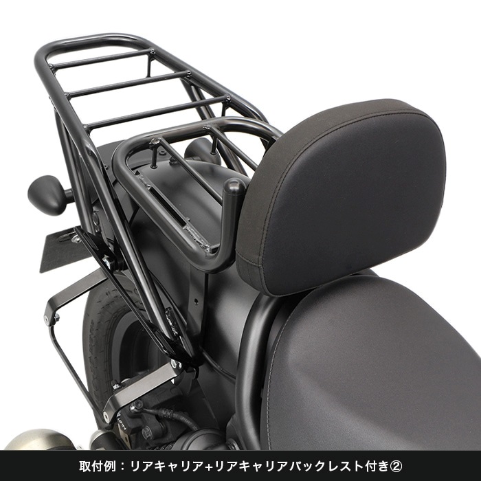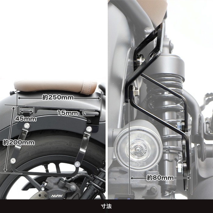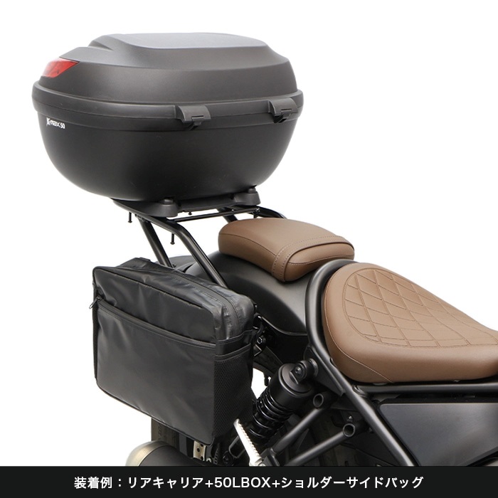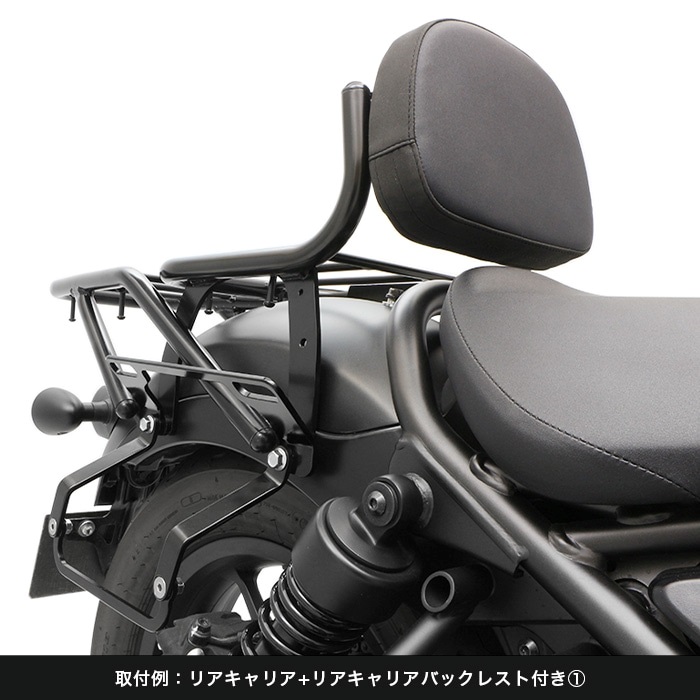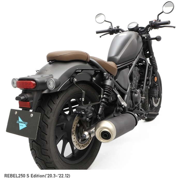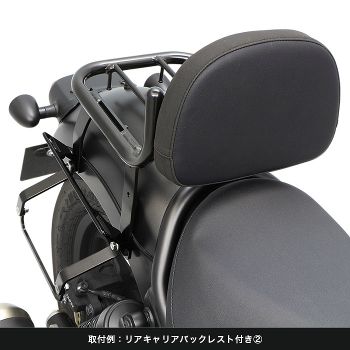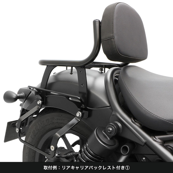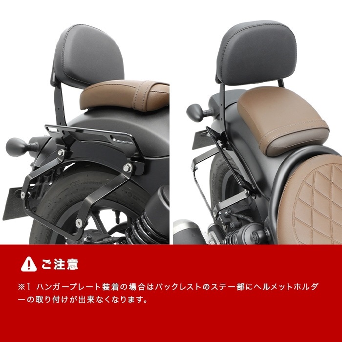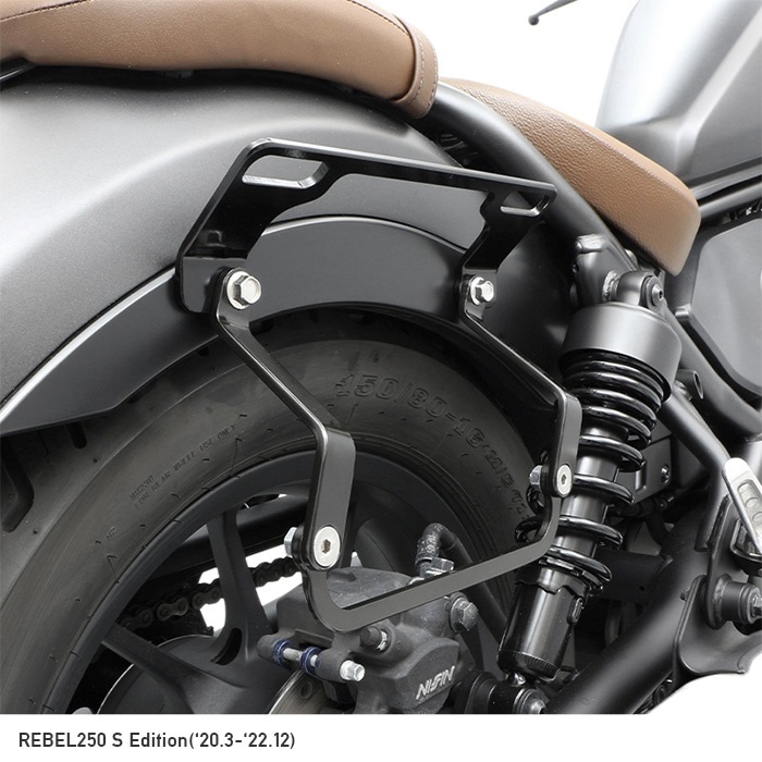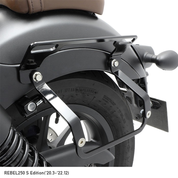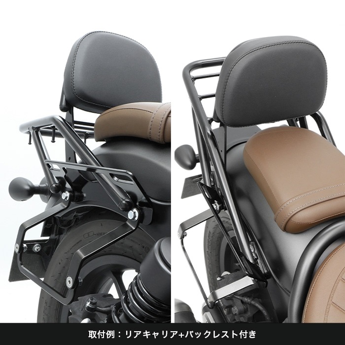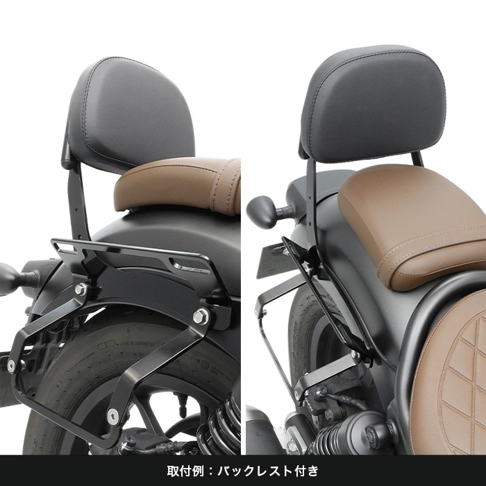レブル専用でリニューアル、片掛けサイドバッグ用の「ハンガープレート」の形状変更により、バッグの傾きを見直し 同社製リアキャリアと「ハンガープレート」との同時装着も可能になりました。