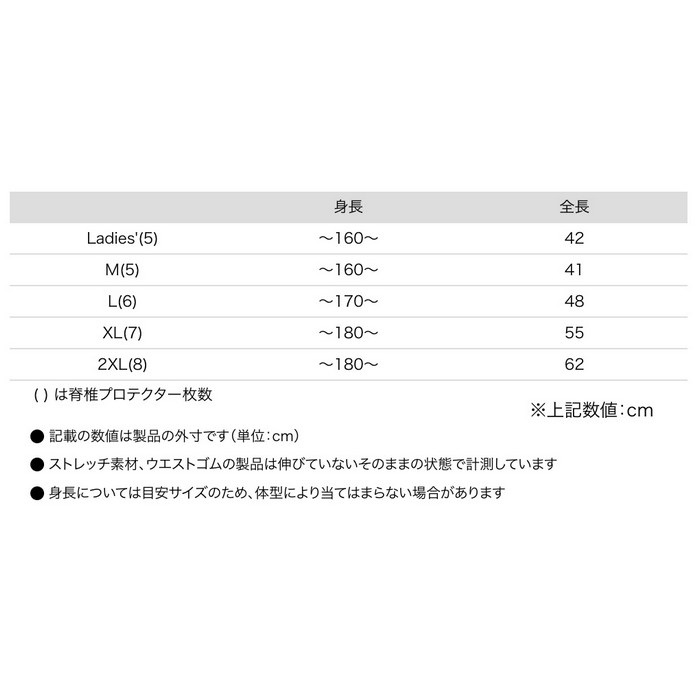 サイズ横の( )内の数値 は脊椎プロテクター枚数