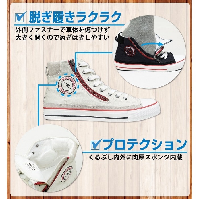 機能も充実。斜めに大きく開くファスナーは脱ぎ履きしやすさ抜群、外側ファスナーなので車体を傷つける心配がいりません。