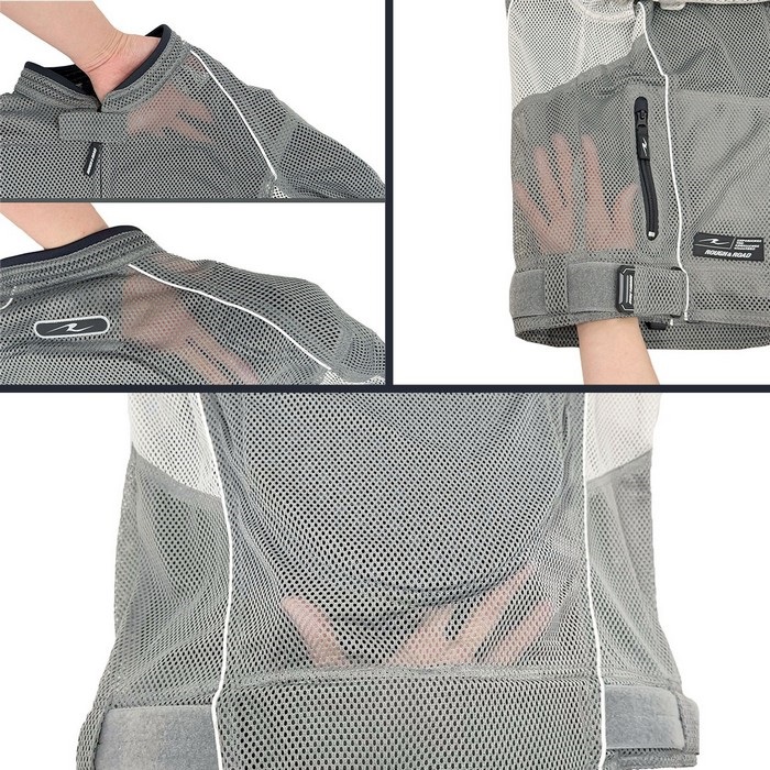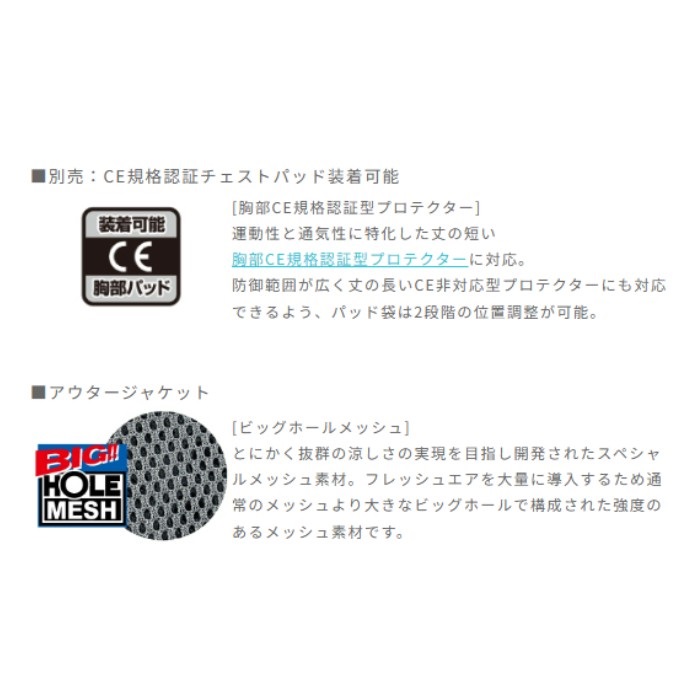 ライディングへの集中を妨げる酷暑から、ライダーを解放するのがこのジャケットの使命です。ビッグホールメッシュ生地をメインに使用することで、大量のフレッシュエアを導入しボディをクールダウン。