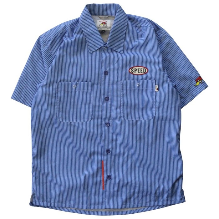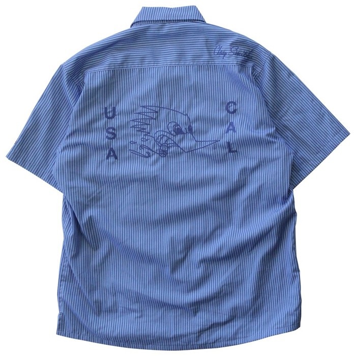 アメリカを感じさせるストライプ柄のワークシャツは、控えめな胸元のパッチと背中の刺繍デザインと良いバランス。