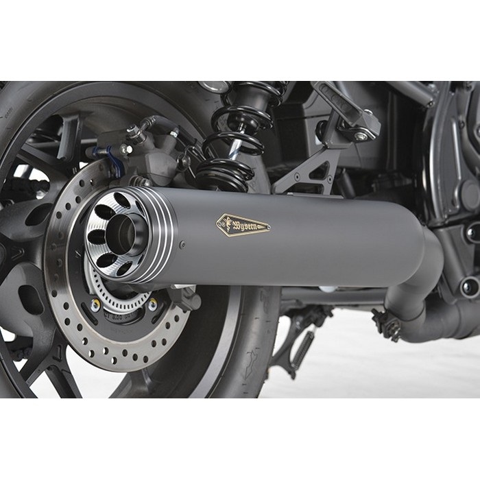 サイレンサーエンドにアルミ合金削り出し加工の、リボルバーデザインサイレンサーを採用。さらに繰り返しの音質開発によりスタイルにマッチした、心躍る重低音ツインサウンドを実現の刺激的なマフラーが完成しました。