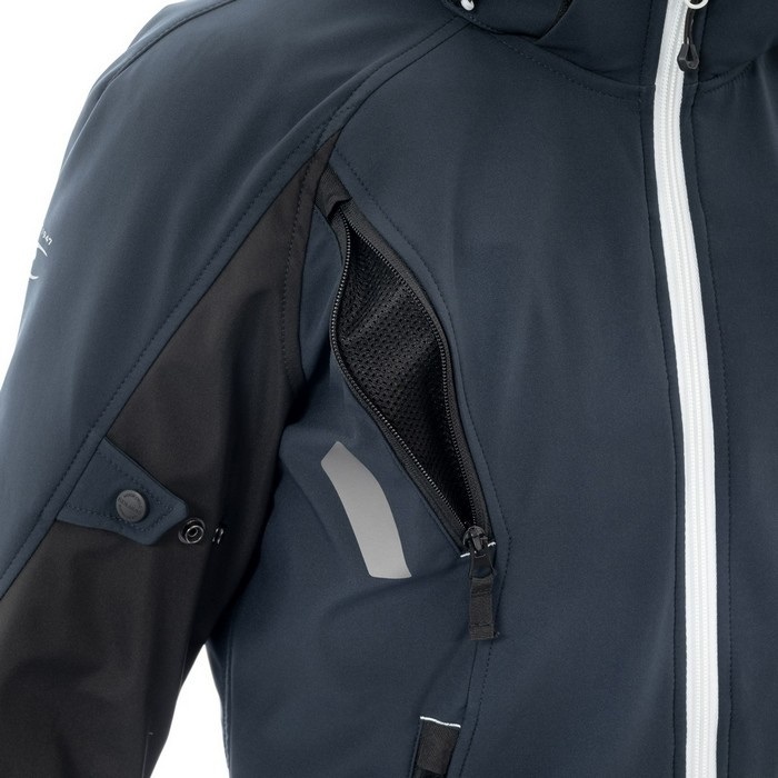 防風性と保温性に優れたソフトシェル素材を使用したフード付きウインター ジャケット。
