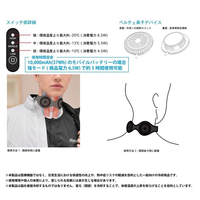 酷暑対策に、ペルチェ素子を頸部の頸動脈と頸静脈の位置に配置することで、血流を冷却し、体温を効果的に下げることが期待できる頸部装着型の冷却具。