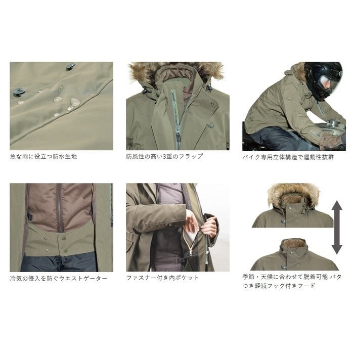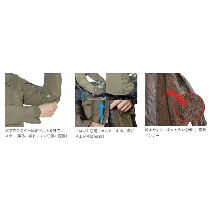 ミリタリージャケット「N-3B」をモチーフにしたロング丈のライディングジャケット。冷えやすい腰回りをしっかりカバーし、3重のフロントフラップ構造とウエストゲーターが走行時の冷気の侵入を防ぎます。中綿×なめらかな肌触りのボアが特徴の極暖インナーと合わせれば、真冬の寒さも気にならないあたたかさ。フロントには逆開ファスナーを採用し、裾のずり上がり軽減やボトムスへのアクセスにも配慮しました。フロント下部のボタンにはタンク傷つき防止カバー付き。インナー脱着でロングシーズン対応し、街使いにもなじむ一着です。 今季はカラー展開を一新して登場。機能性はそのままに、よりスタイリッシュな冬の装いを演出します。