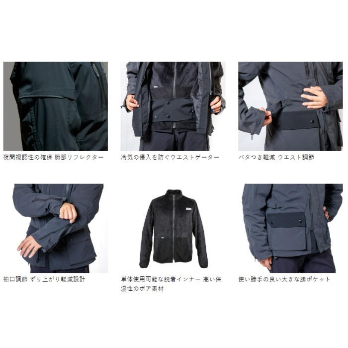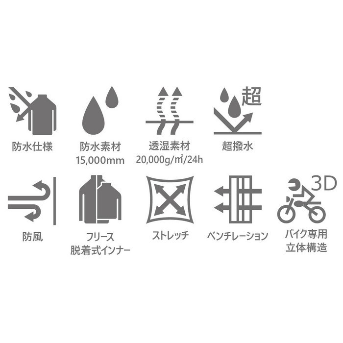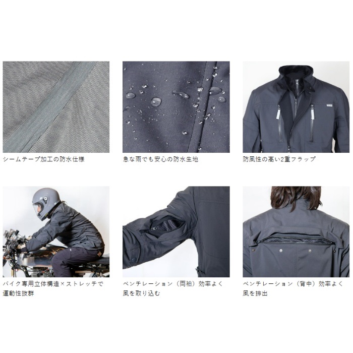 アドベンチャーライドに対応する本格仕様のライディングジャケット。防風・防水・透湿・超撥水の実用素材に、シームテープ加工を施した防水仕様で、天候の変化にも柔軟に対応します。フロントは防風、防水性能を高める2重フラップを採用。内側には、軽くてやわらかな着心地のボアインナーを装備。脱着式で単体着用もでき、寒さやシーンに合わせて柔軟に使い分けが可能です。脇と背中にはベンチレーションを配置し、ムレを逃して快適性もキープ。冷え込みが強い日には、ウエストゲーターで裾からの風の侵入も防げます。ウエストベルトでフィット感を調整でき、長時間の走行でもバタつかず快適。腕にはリフレクターを備え、夜間の視認性も確保します。ラフに見えて、しっかり使える。まさに走りを楽しむための一着です。