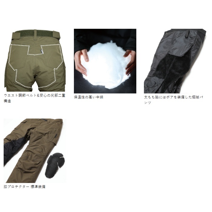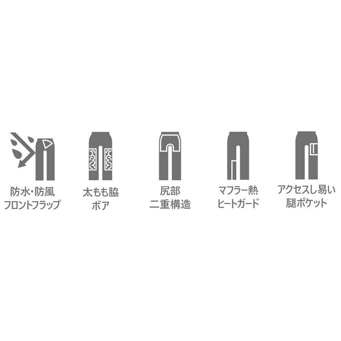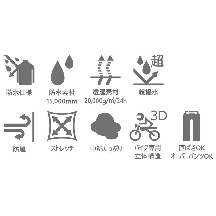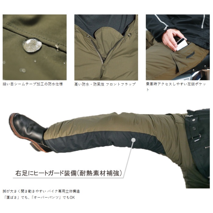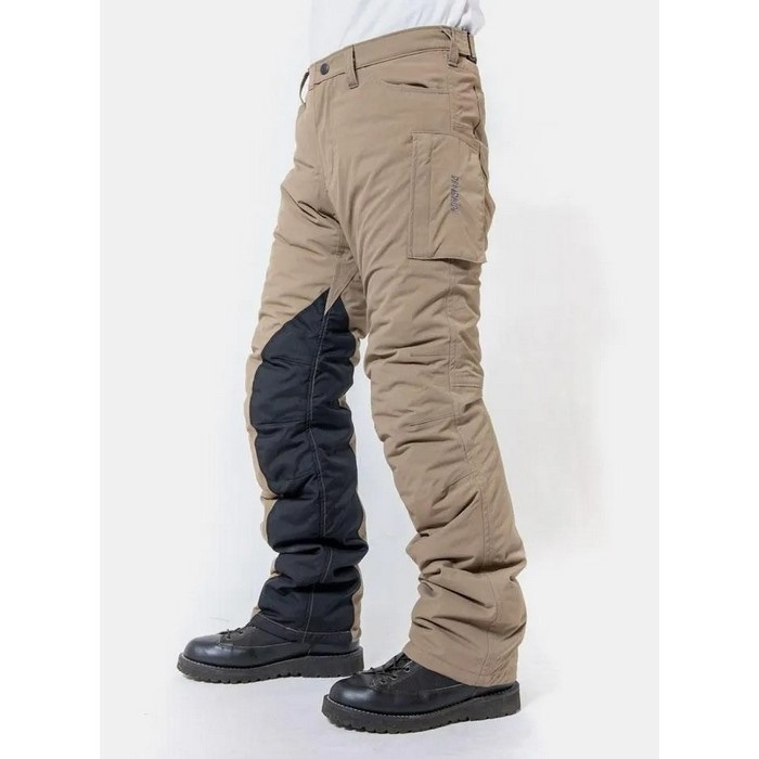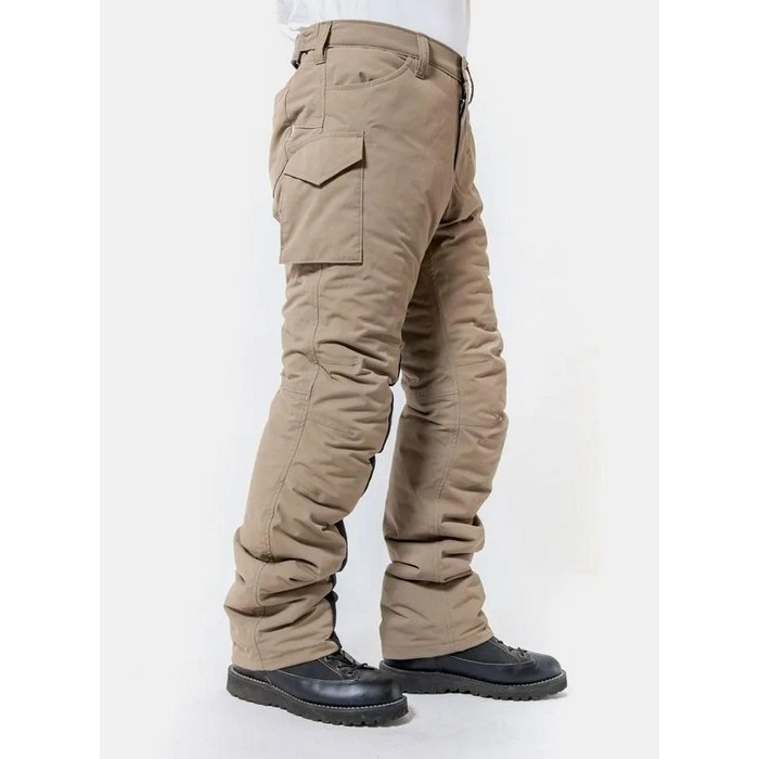 寒さに妥協したくないライダーのための、カジュアルに着られる冬専用カーゴパンツ。防風・防水・透湿・超撥水と、全天候に対応する素材を採用し、縫い目にはシームテープ加工を施した本格防水仕様。中綿と太もも内側のボアによる二重の保温構造が、厳しい冷え込みでも快適な暖かさをキープします。それでいて軽量で、POWERAGE独自のバイク用立体構造により、脚上げや膝曲げもストレスフリー。尻部の二重構造やニーグリップ、右足のヒートガードなど、基本装備も充実しています。直ばき・オーバーパンツのどちらとしても使える柔軟な設計で、ツーリングから街乗りまで幅広く対応する、冬の頼れる一本です。