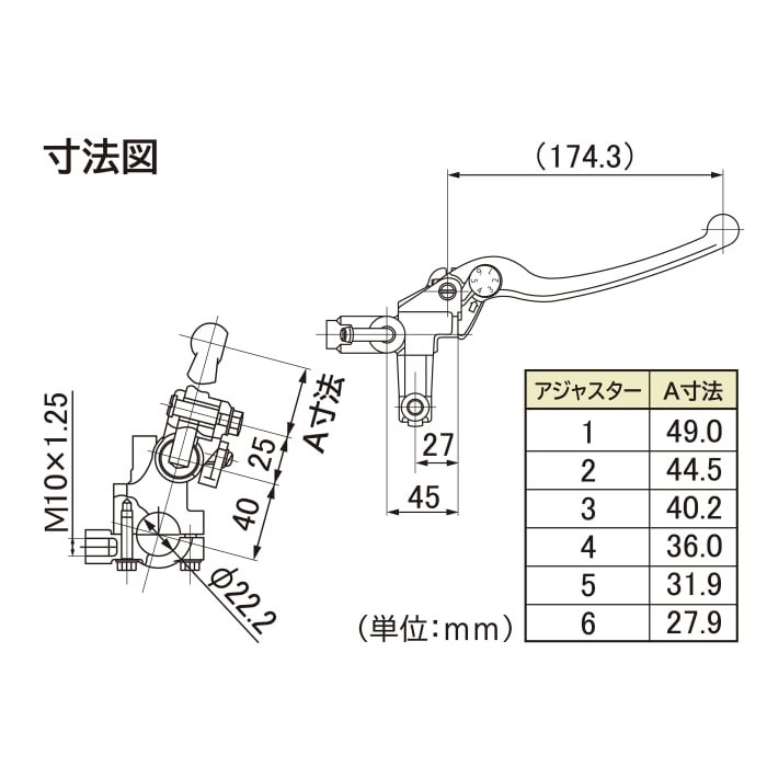 ※ご使用のキャリパーとの組み合わせによっては必要ブレーキ液圧が発生する前にレバーがグリップに当たり使用できないレバーアジャスター位置があります。レバーアジャスターの調整を行ない、ブレーキが十分に効き、なおかつレバーがグリップに接触しないレバーアジャスター位置でご使用ください。調整しきれない場合は別売りの4段調整レバー (バフクリアー/23319) または (ブラック/27354) をご使用ください。