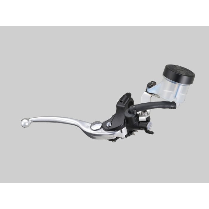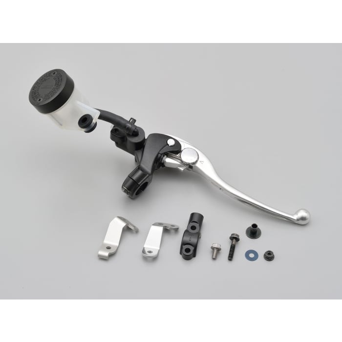 従来の横型マスターよりも油圧レシオを小さく、レバーレシオを大きく設定し、ラジアルタイプ特有のダイレクト感にできるだけ近づけたセミラジアルブレーキマスターシリンダー。構造上、ラジアルマスターシリンダーが取付困難な車両にもオススメ。標準ステーの他、ネイキッドモデル装着時にフルードタンクが斜めにならない専用アルミタンクステー (クリアーアルマイト/46852) 付属。
