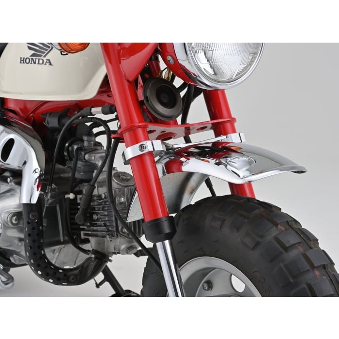 モンキー/ゴリラのノーマルフェンダーをアンダーブラケットから下方向に移動し、スタイリッシュなデザインで、フロント回りをゴージャスに演出するクランプキット。泥ハネも軽減します。