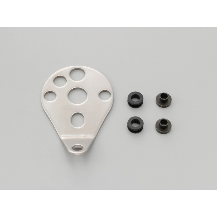 機械式メーターΦ60/85用の防振メーターステー。3mm厚のステンレスミガキ材に防振ラバーを組み込みました。メーター取付ピッチ45mm。M8ボルト (付属なし) にて取り付け。