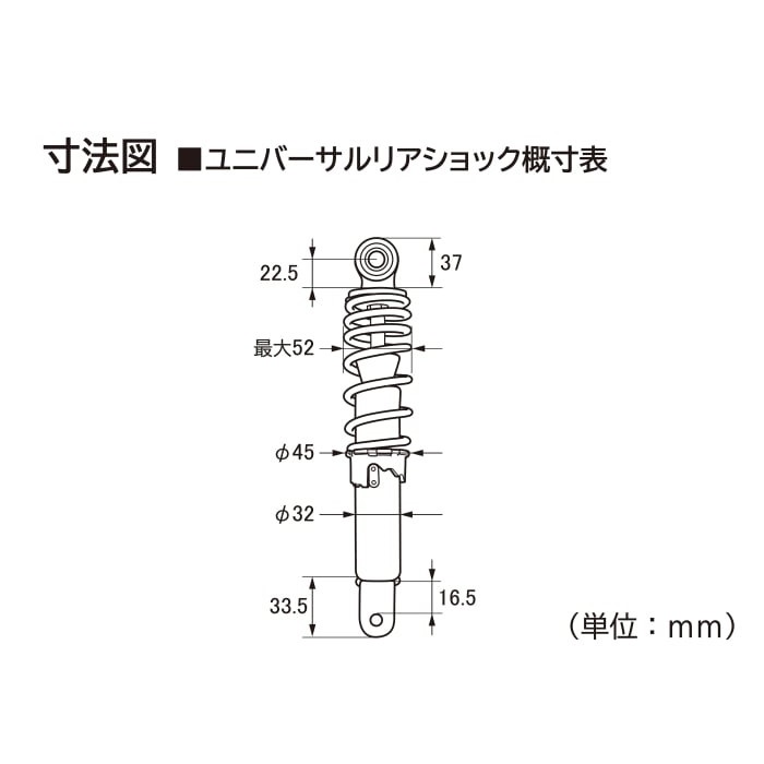 ※装着する車両の純正リアショック取付長と同等サイズを選択してください。短い場合はサイドスタンドが使用できなくなったり、エアクリーナーBOXやタイヤなどが走行中に車体接触する可能性があります。また、少なくとも純正リアショック取付時と同等の周辺クリアランスを確保する必要があります。