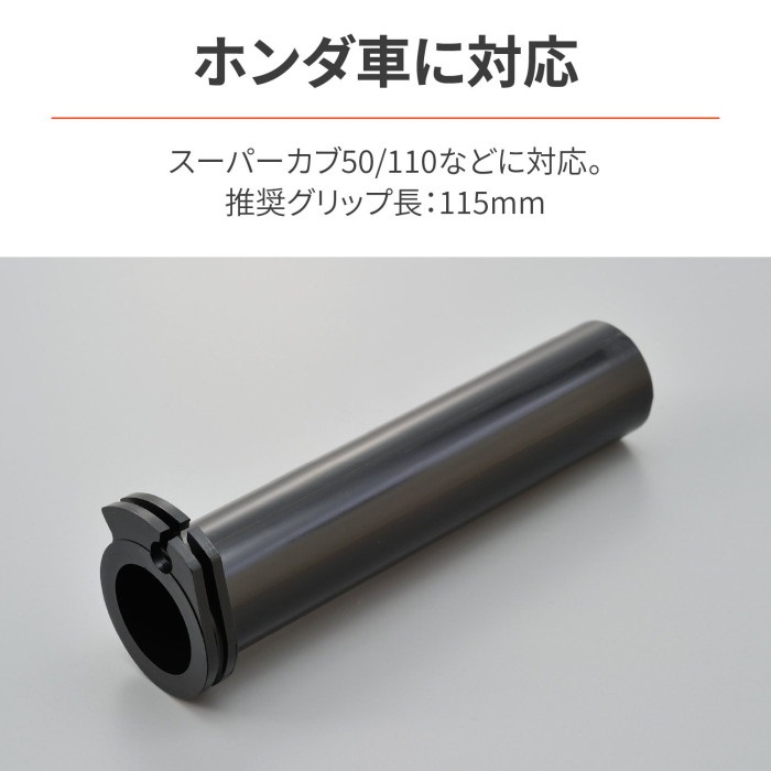 グリップ回り止めのリブが無いスロットルスリーブ。リブを削る必要が無いので、カスタムグリップへ交換する際などに便利です。純正スリーブは車種により白色や灰色、黒色の仕様がありますが、目立ちにくい黒色で設定しています。