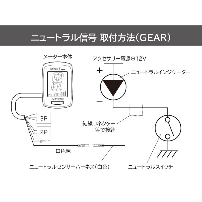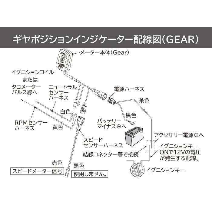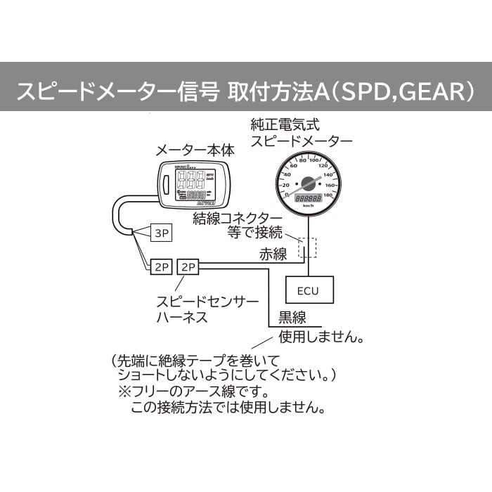 ※機械式スピードメーターから変換アダプター等を使用して取り付けるとスピードメーターの信号をうまく認識できず、初期設定が完了しません。