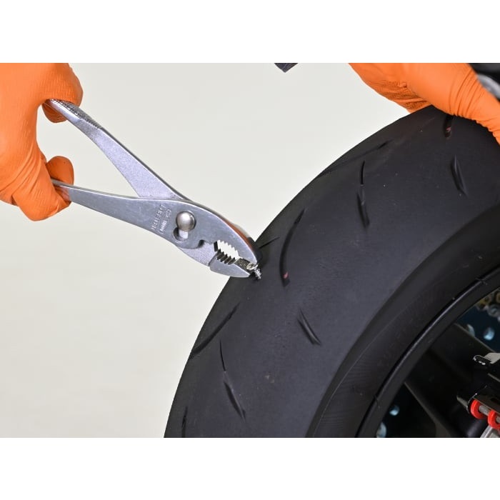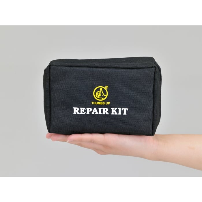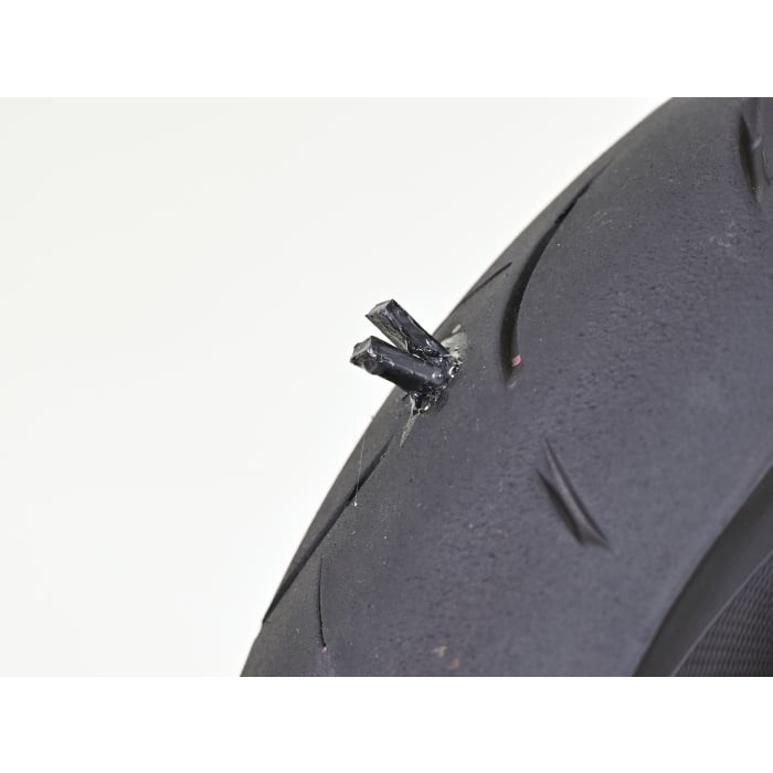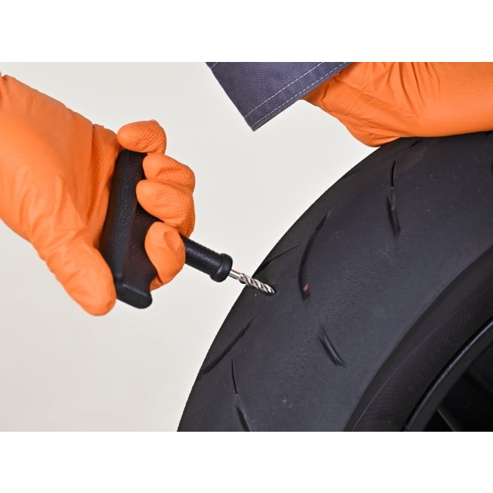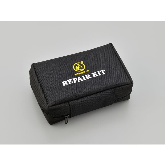 チューブレスタイヤ専用の持ち運びやすいコンパクトサイズの収納ケース付きパンク修理キット。エアボンベ3本付属で、ツーリング先での応急処置が可能。