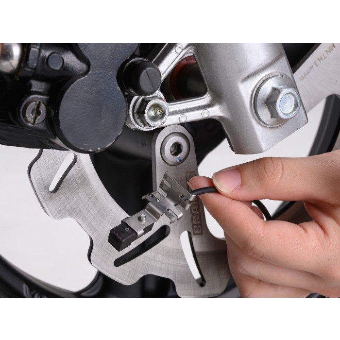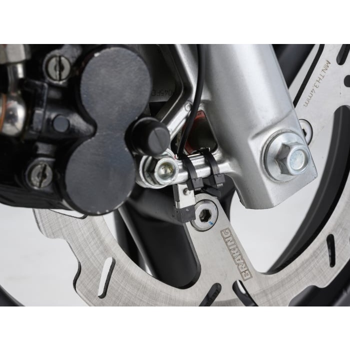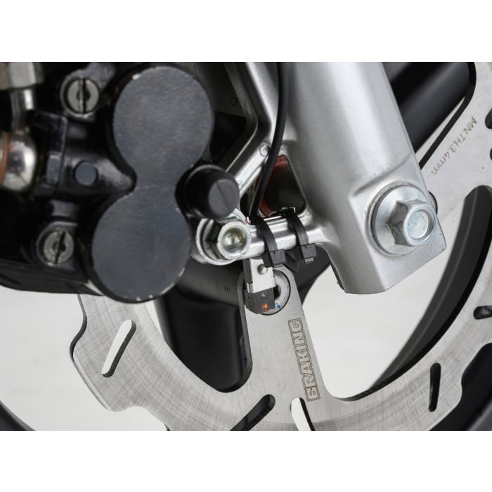 センサーの取り付けはフロントフォークのボトムケースに専用ステーをタイラップ等で固定するだけなので、ほとんどの車両からスピードパルスを発生させることができるます。