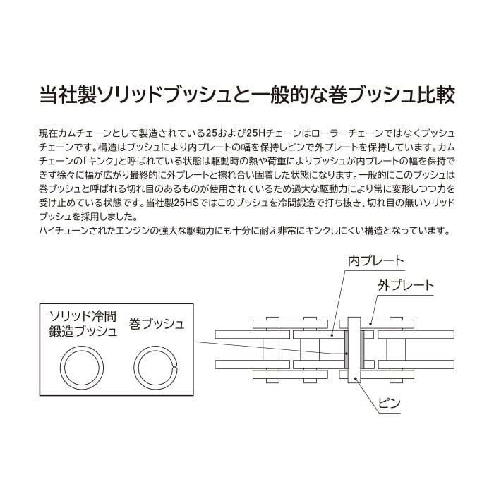 現在カムチェーンとして製造されている25および25Hチェーンはローラーチェーンではなくブッシュチェーンです。構造はブッシュにより内プレートの幅を保持しピンで外プレートを保持しています。カムチェーンの「キンク」と呼ばれている状態は駆動時の熱や荷重によりブッシュが内プレートの幅を保持できず徐々に幅が広がり最終的に外プレートと擦れ合い固着した状態になります。一般的にこのブッシュは巻ブッシュと呼ばれる切れ目のあるものが使用されているため過大な駆動力により常に変形しつつ力を受け止めている状態です。デイトナ社製25HSではこのブッシュを冷間鍛造で打ち抜き、切れ目の無いソリッドブッシュを採用しました。ハイチューンされたエンジンの強大な駆動力にも十分に耐え非常にキンクしにくい構造となっています。