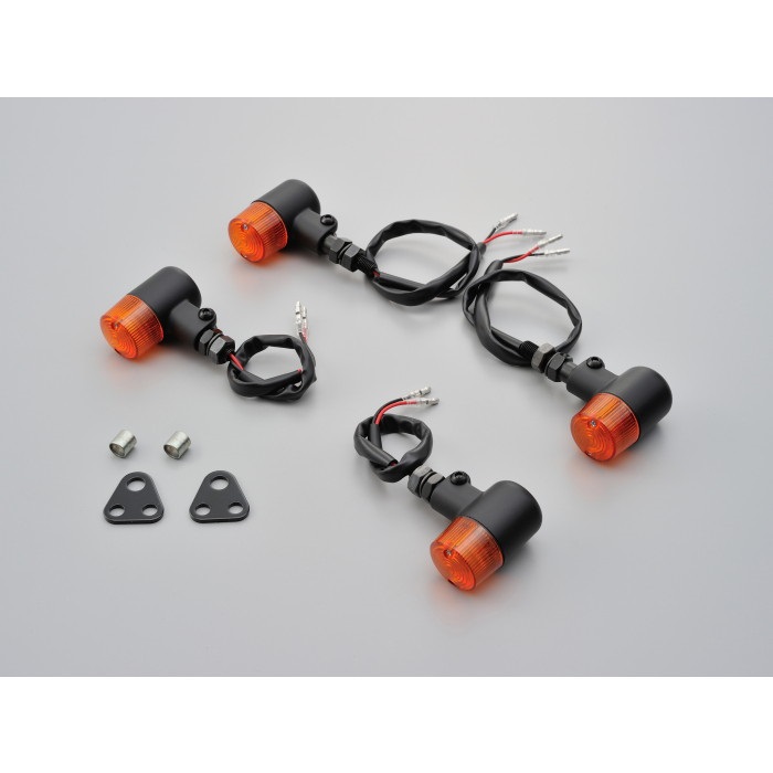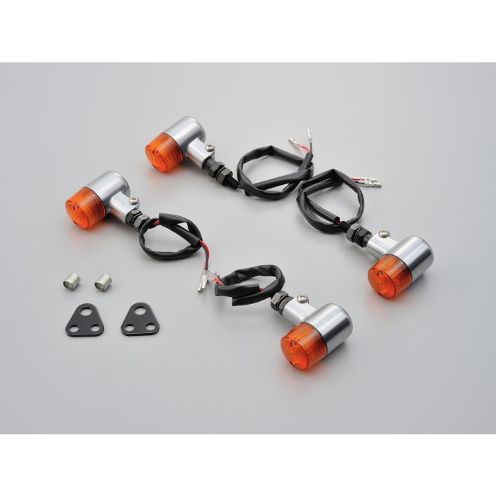 ステー差し込み式スモールウインカーの1台分キット。ウインカー4個と専用取付ステー付。配線加工不要のボルトオン設計です。クリアーバルブ12V/23W付属。