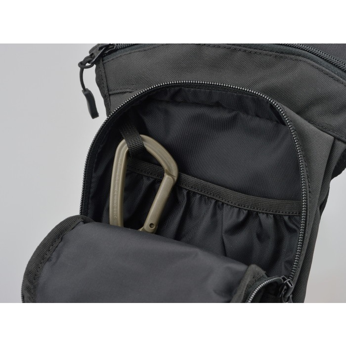 身の周りのものをすっきり身に付けられるホルスタータイプのバッグ。小物収納のほか、長財布がすっぽり入る長物収納、スマートフォンが入るフラップ収納の3室構造。フロント面のフラップ収納部分はワンタッチ開閉できるバックル式。回転式バックルとバタつき防止用のサポートベルトで装着時の密着性を高めました。また、裏側は通気性に優れるメッシュ仕様でストレスの少ない装着感を実現。素材はどんなウエアにも似合うポリエステル。