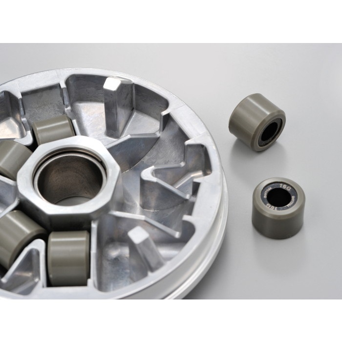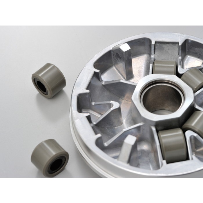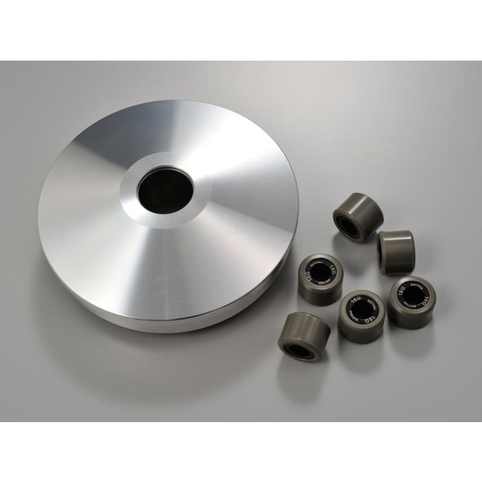 加速&最高速アップのためローラーガイド形状をとことんまで煮詰めたハイスピードプーリー。プーリーボス挿入部はドライメタルを採用。ノーマルマフラーに合わせた軽すぎないウエイトローラー16g×6個付属。