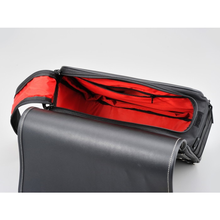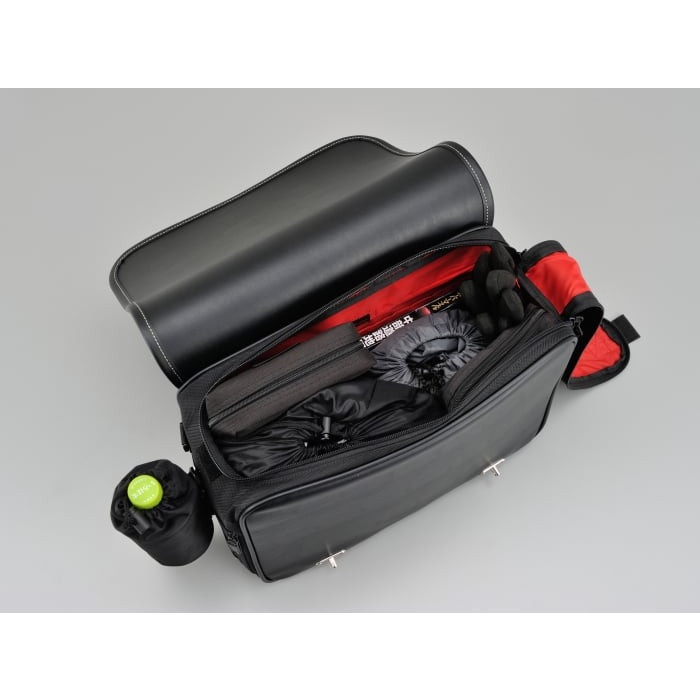 内装は、ライダースジャケットをイメージした赤色にすることで、収納した荷物を見やすくしています。レインカバーが付属しているので、急な雨でも安心です。