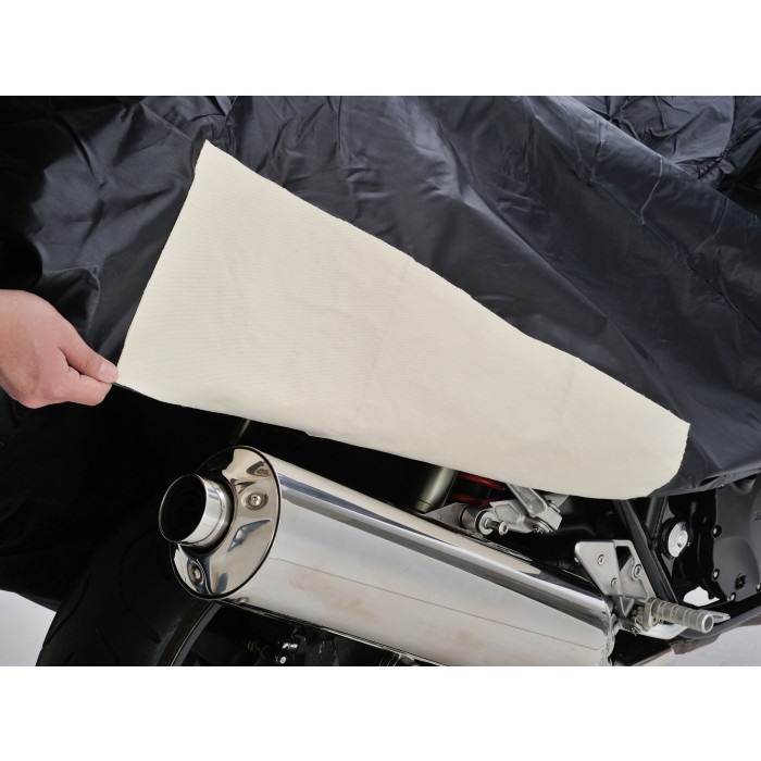 マフラーの熱からバイクカバーを守る耐熱パッド (23×70cm) 付属。高温部分と接触するバイクカバー内側に貼り付けて使用します。