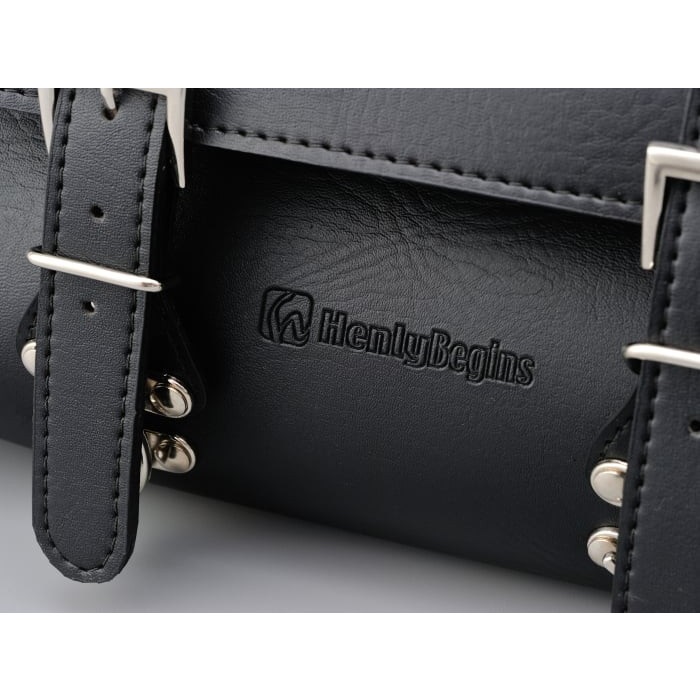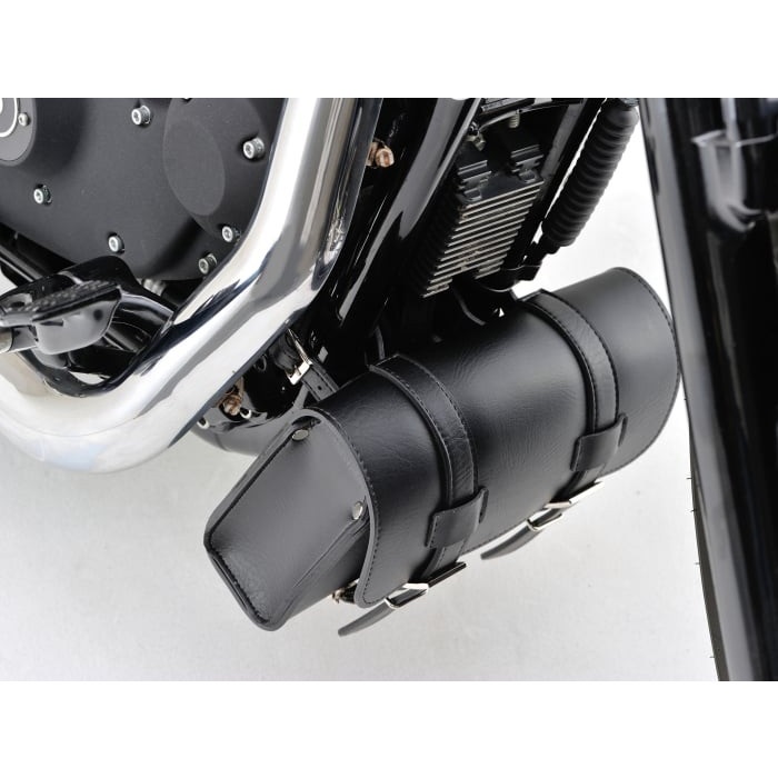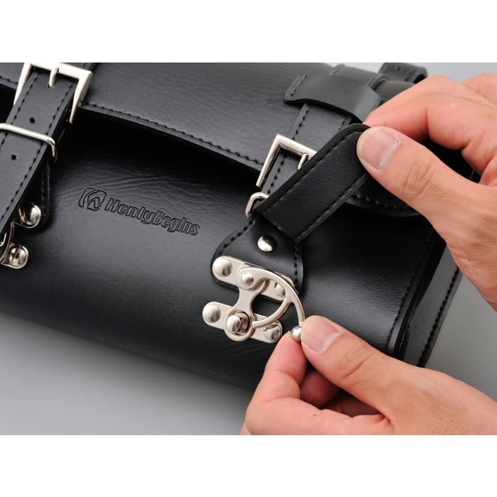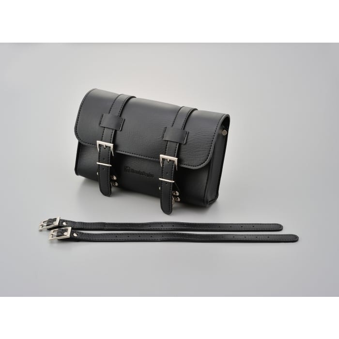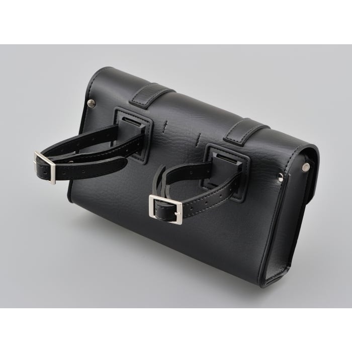 収納場所が無いハーレーや国産アメリカンなどに工具や書類を積載できるツールバッグ。固定ベルトの取り付け穴が縦・横に開いているので、ハンドルバーやダウンチューブ、シーシーバーなどにも取り付け可能です。
