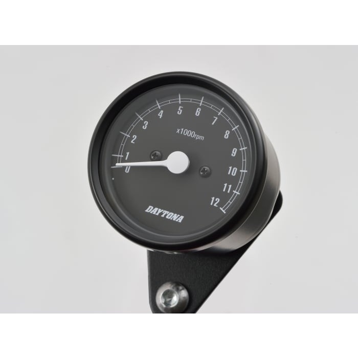 クラシカルなパネルデザインで12000rpm表示のタコメーター (ギヤ比1:5) 。