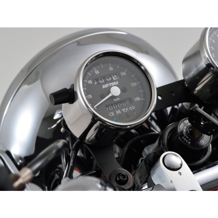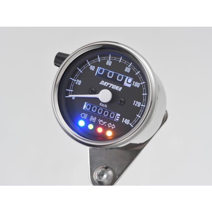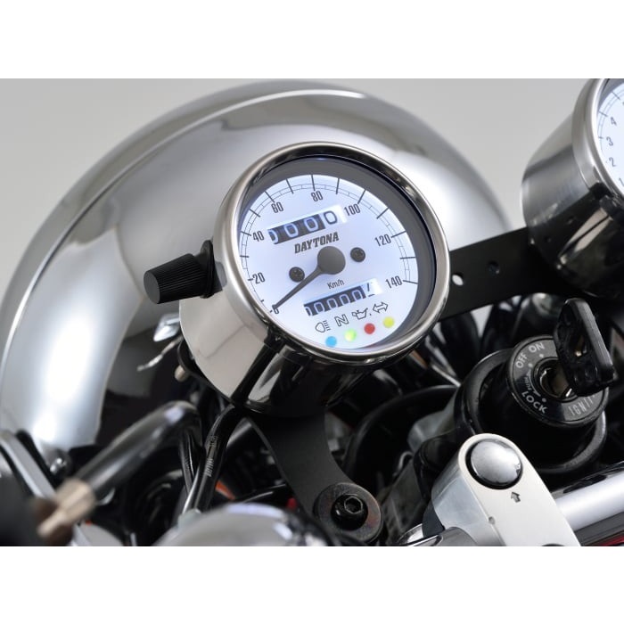 夜間でも視認しやすいLEDバックライトの文字盤を採用。インジケーター付きは、ハイビーム、ニュートラル、油圧、ウインカーを内蔵。