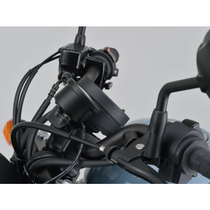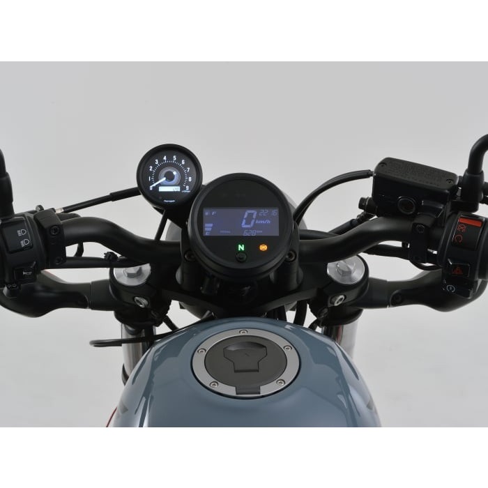 Rebel250/500の雰囲気にマッチしたブラックボディのVELONA Φ60 タコメーターキット。ボルトオンで純正スピードメーター左上にバランス良く配置できます。メーターは常用回転域で見やすい9000rpm表示。メーターステーは振動対策のためラバーマウントを採用しています。