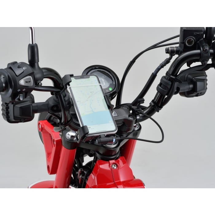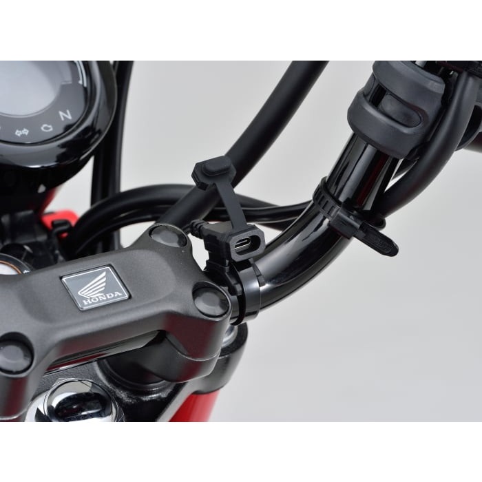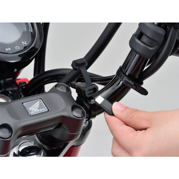 USB PD(Power Delivery)対応でスマホの急速充電が可能。MAX18Wの高出力。メインキー連動でバッテリー上がりの心配なし。ブレーキスイッチとフレームのボルトに共締めするだけの簡単取り付け。取り付け場所を選ばないコンパクトなボディでハンドル周りもスッキリ。