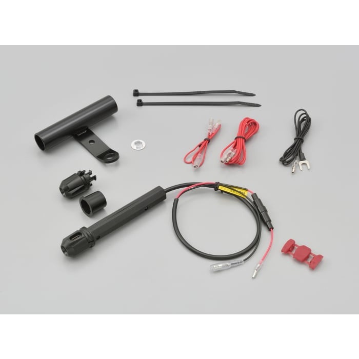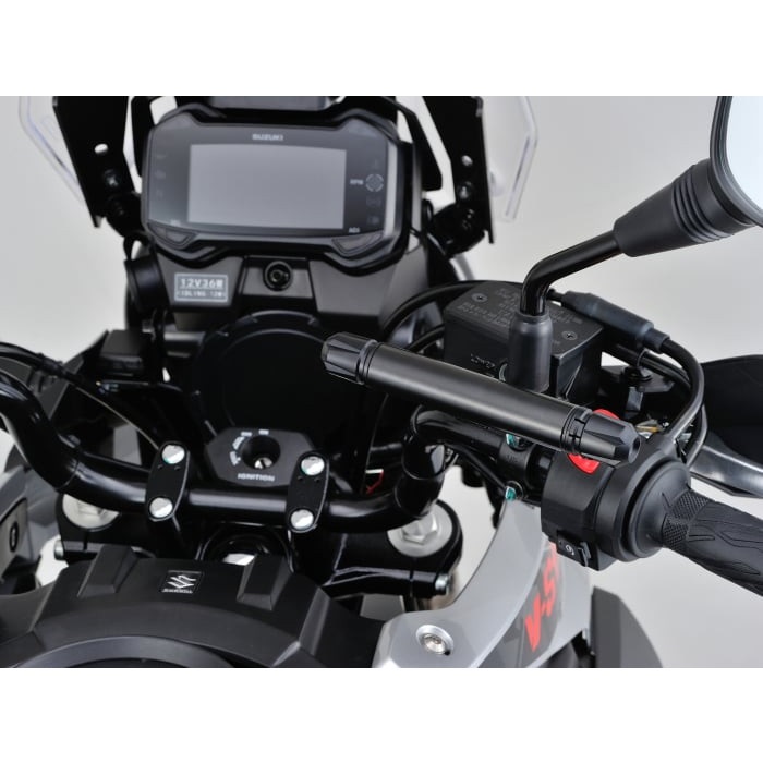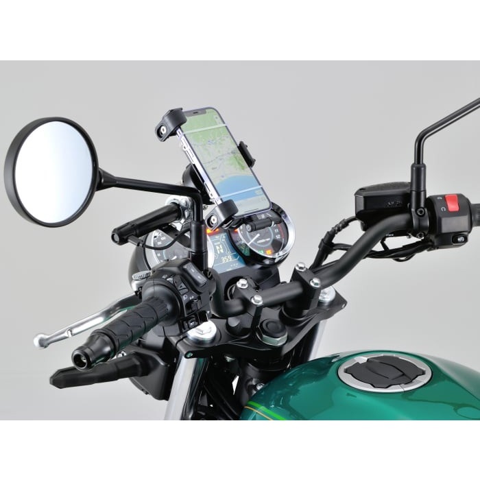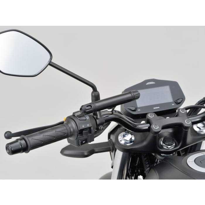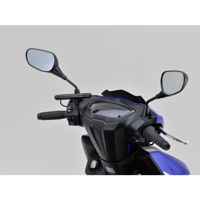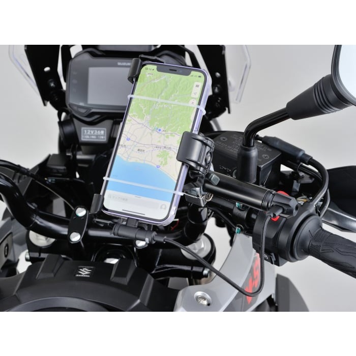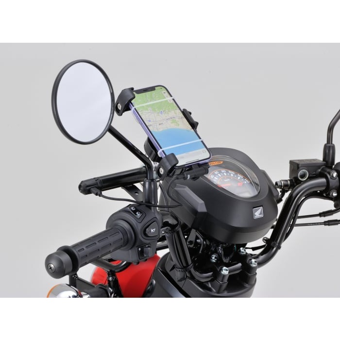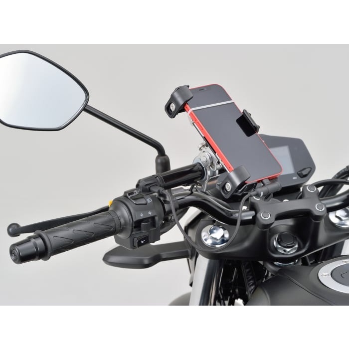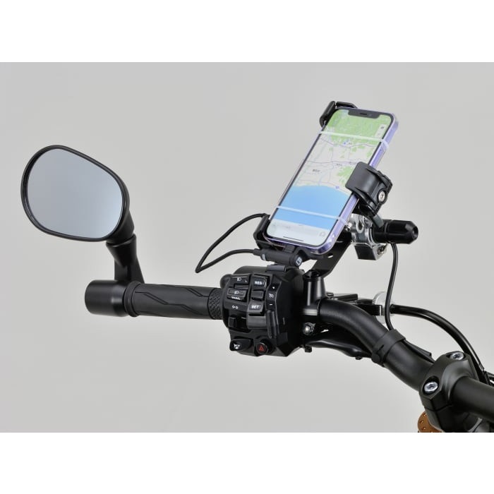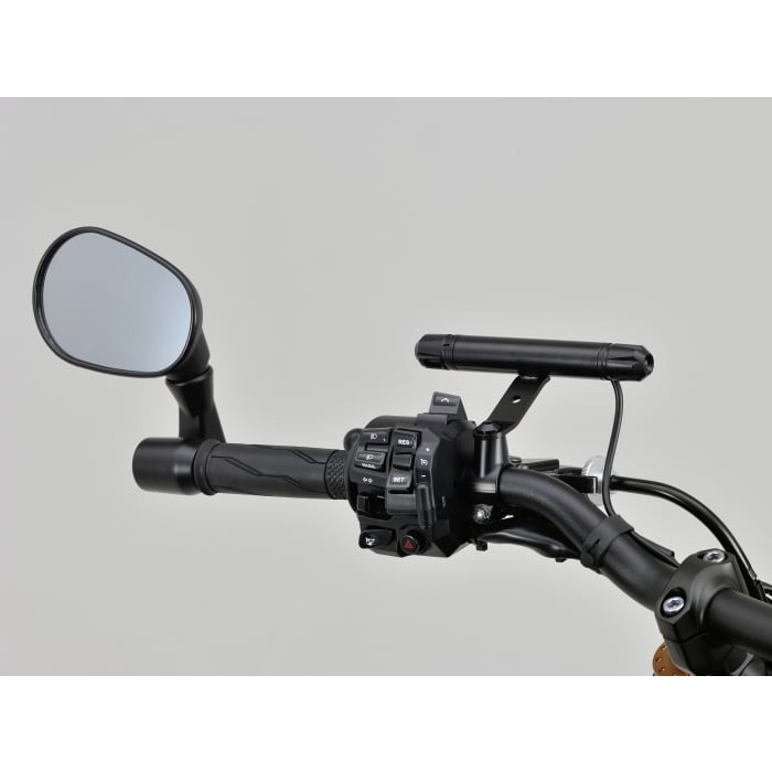 好評のマルチバーホルダーにUSB Type-Cの電源を組み込みました。ホルダースペースを有効活用できます。PREMIUM ZONEバーエンドイメージのスタイリッシュなデザイン。USB PD 3.0で急速充電に対応。ミラー取付部に装着可能。バーリングワッシャー付属でM10ミラー/M8ミラー両方に対応します。ステー中央にスマホなどの脱落を防止するためのワイヤーを通す穴が開いています。