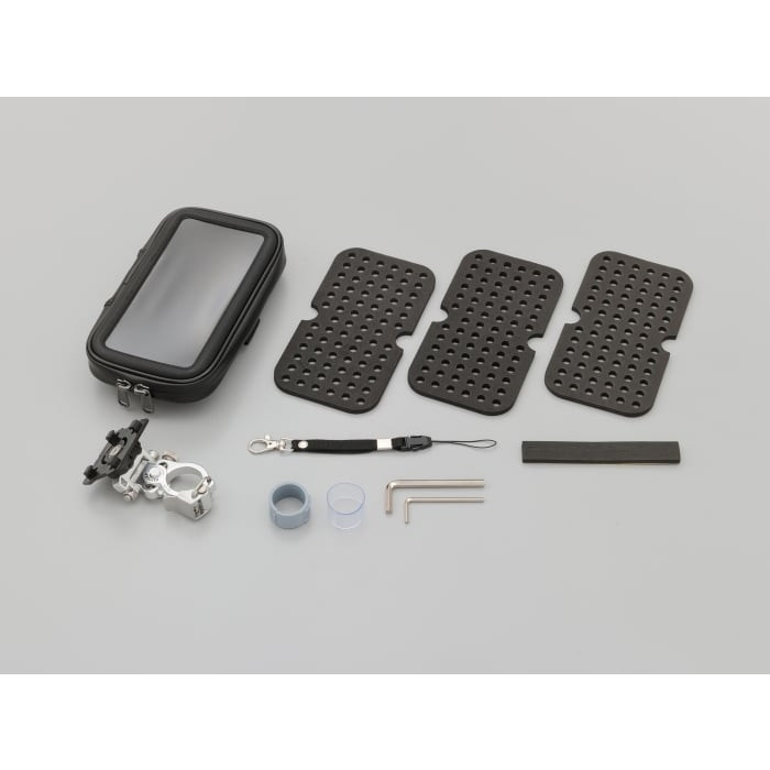また、左右に首振りができるのでバーハンドルの水平ではない斜めに立ち上がる部分にも装着できます。透明窓は、タッチパネルの操作がしやすいように厚みを0.3mmに設定。本体には、タッチペンを収納できるホルダー付き。