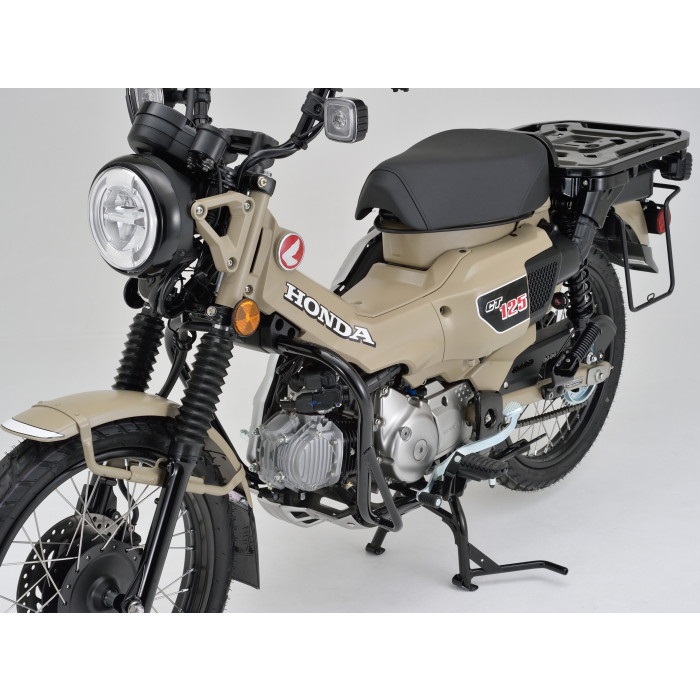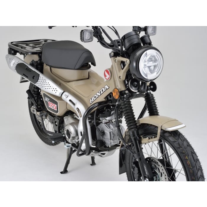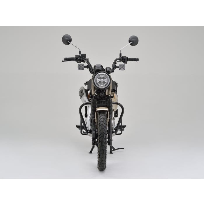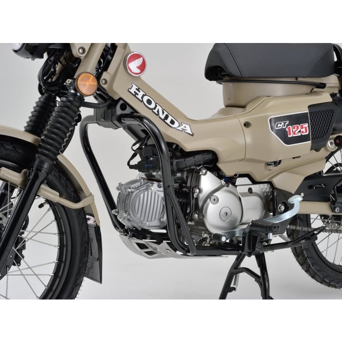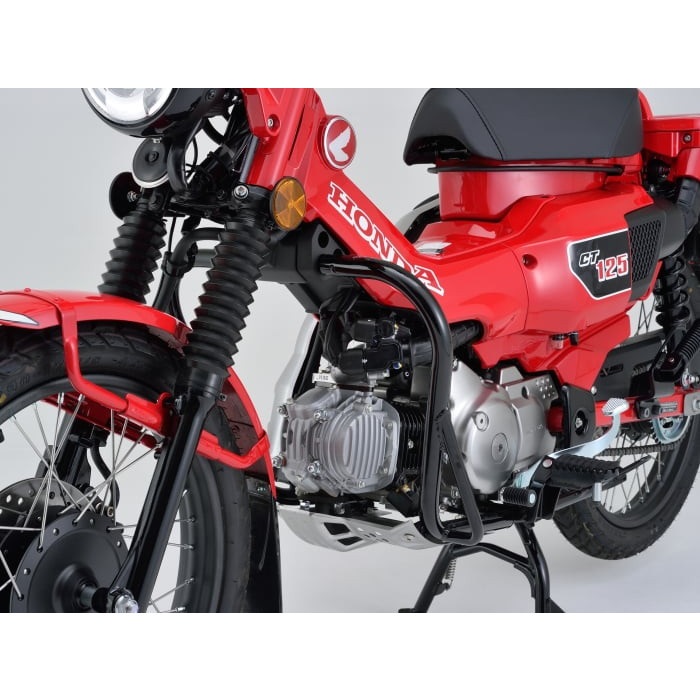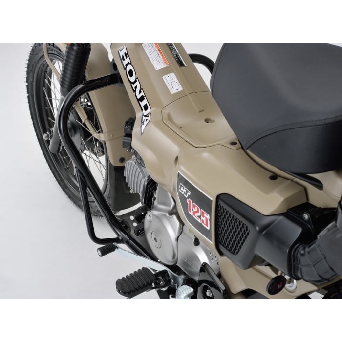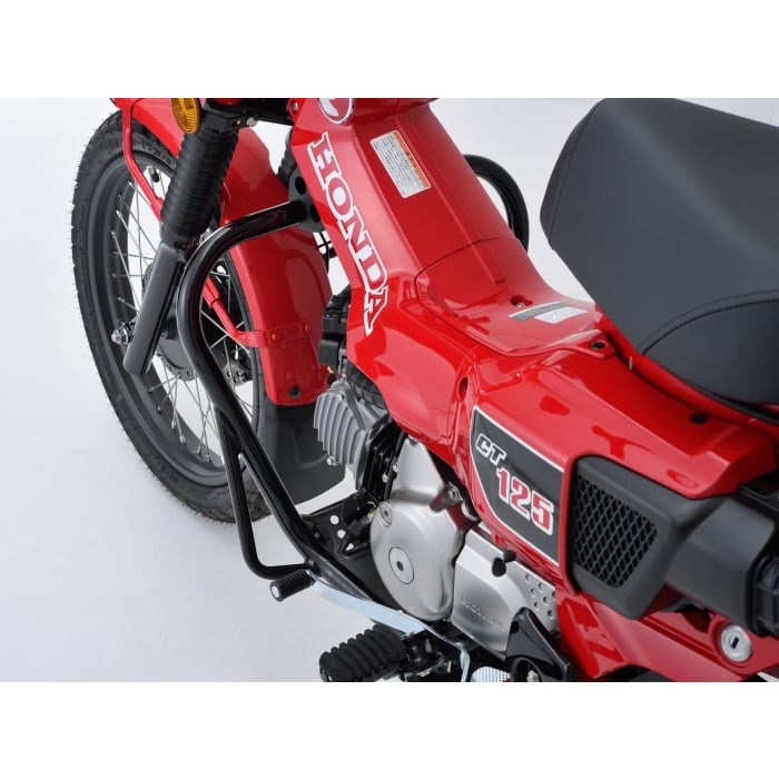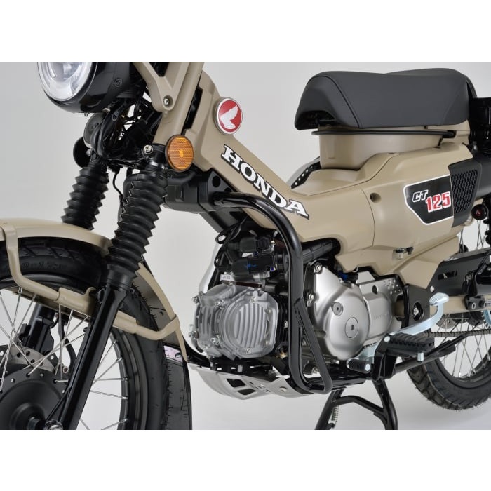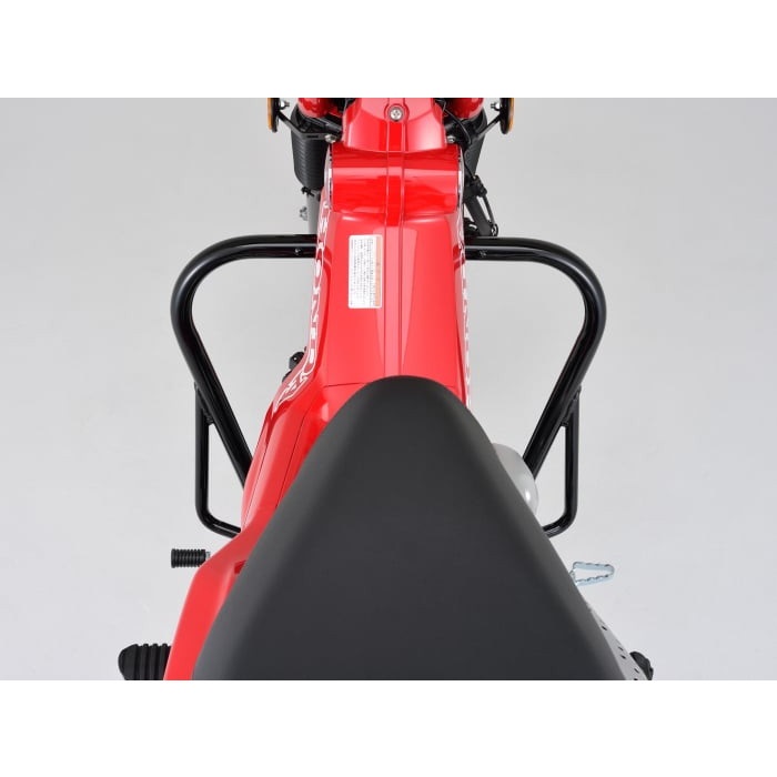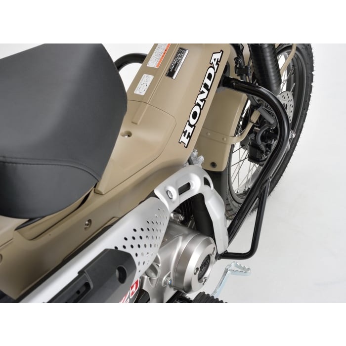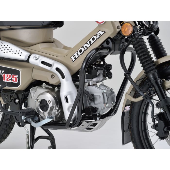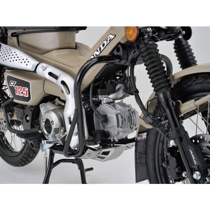 ボルトオン装着可能なΦ25.4スチールパイプ製の強固なエンジンガード。純正アンダーフレームと置き換え。立ちゴケ等の軽度な転倒に対し、エンジンやカウルのダメージを軽減し、ペダル部分まで破損しにくい設計です。エンジンガード本体上側にストレート区間を長く設けたことにより、車体上側の保護のほか、ドライブレコーダーやアクションカメラ等のパイプクランプ取り付けアクセサリーを装着できます。