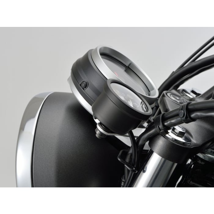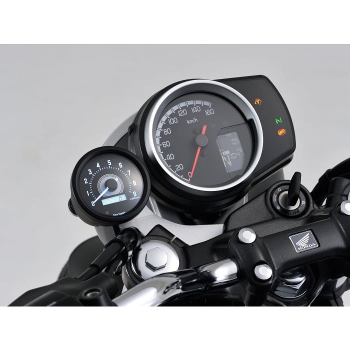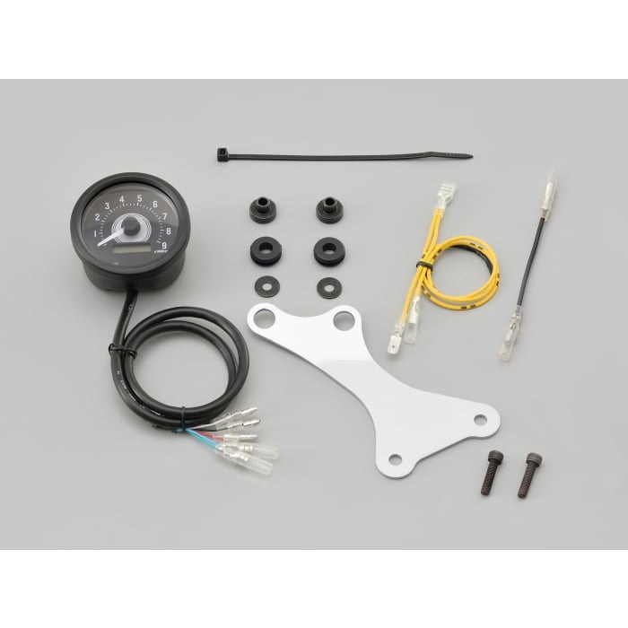 ブラックボディのVELONA Φ60 タコメーターキット。ボルトオンで純正スピードメーター横にバランス良く配置できます。メーターは常用回転域で見やすい9000rpm表示。メーターステーは振動対策のためラバーマウントを採用しています。