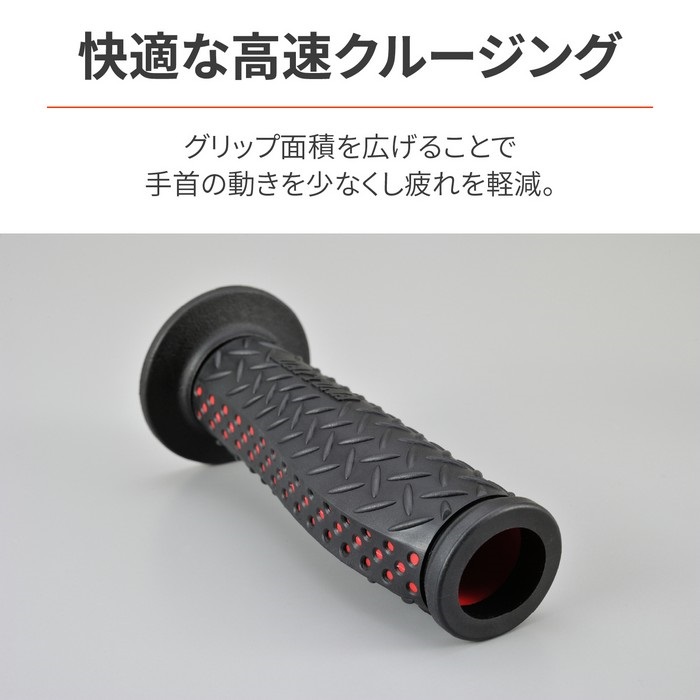手の平の下側にあたる部分を広げることで、スロットル操作時の手首の動きを少なくし疲れを軽減。高速クルージングが快適になります。