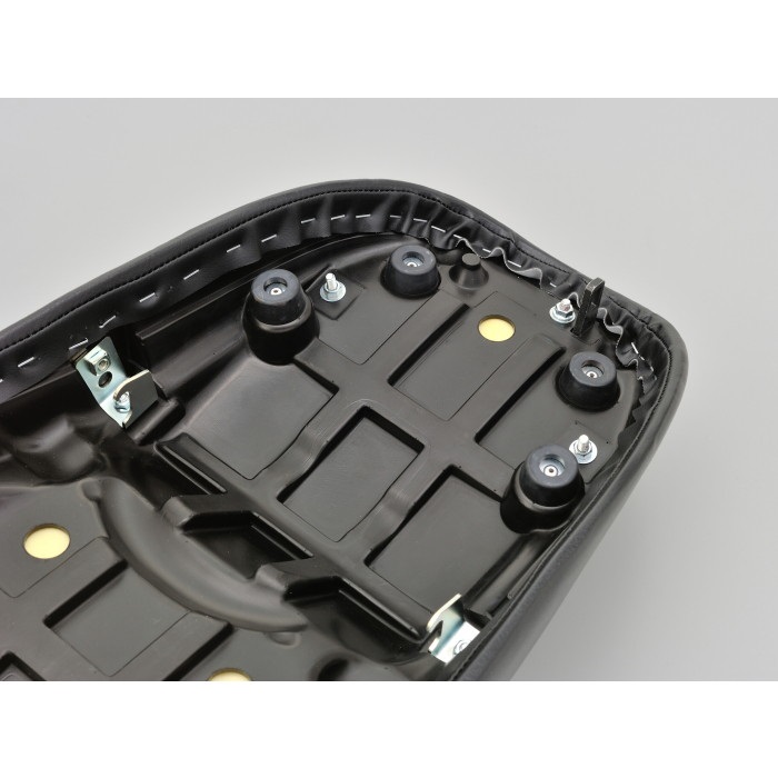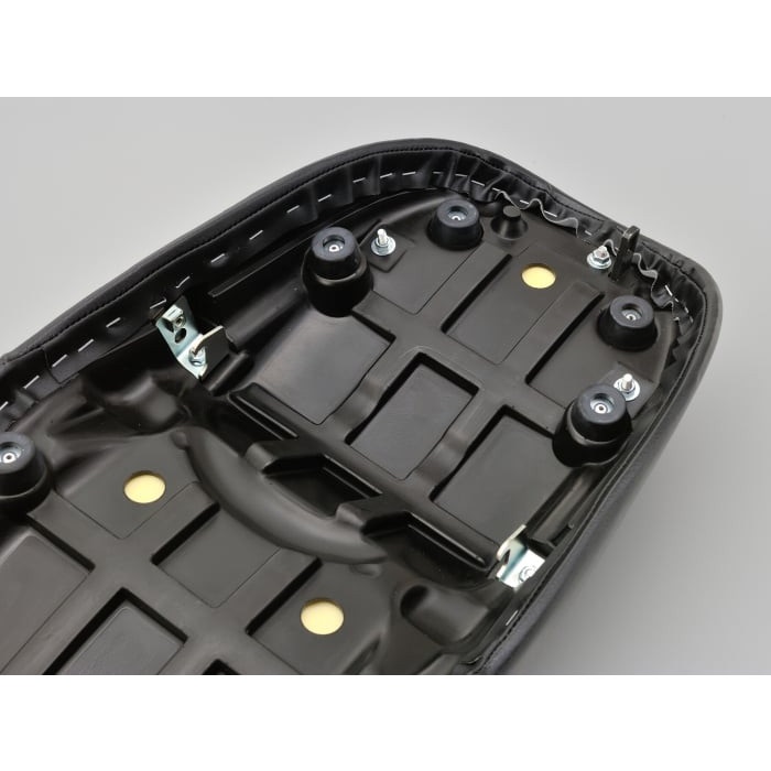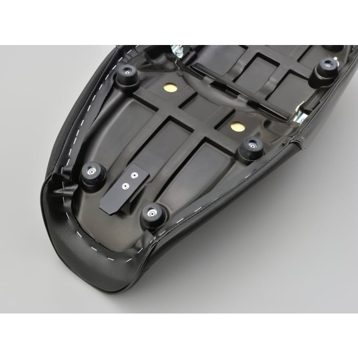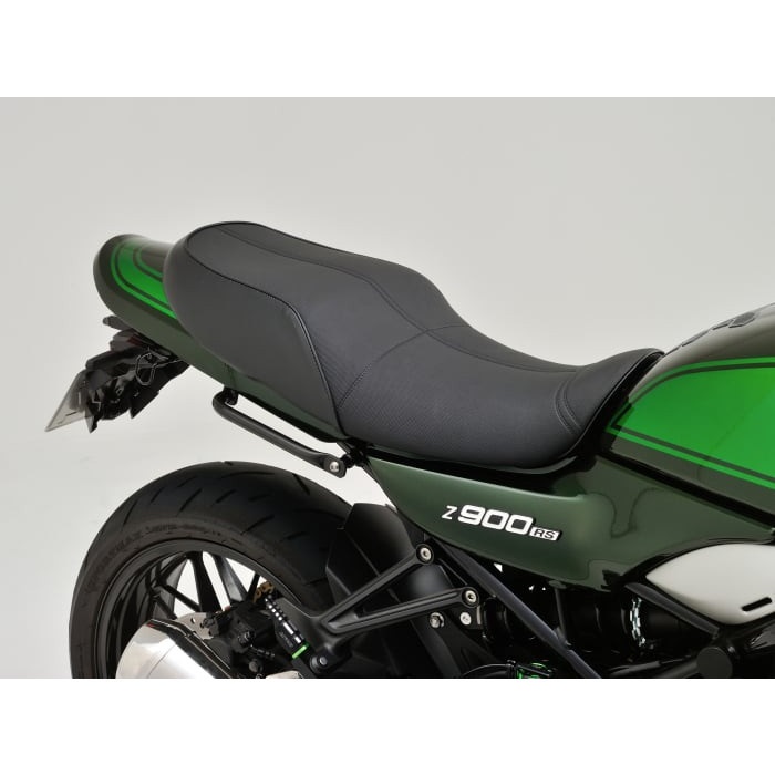 フロントサイド部をカットし、座面を-15mmしたローダウンシート。一体成型の専用ウレタンで足つき性の向上と乗り心地を確保。往年の名車Z1000Rルックのパターンを採用し、Z900RSのフォルムに合わせるようにアレンジ。取り付けに必要な金具、ダンパー類はすべて組み込み済。純正車載工具取付可能です。