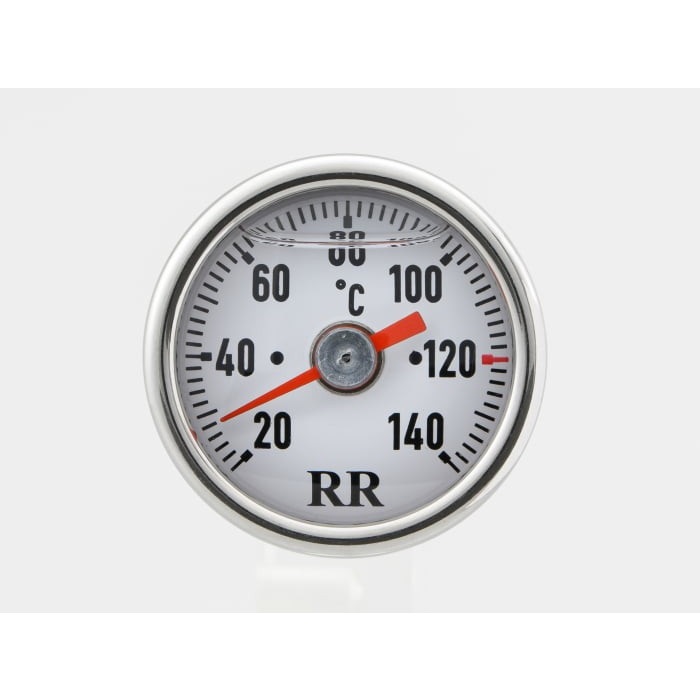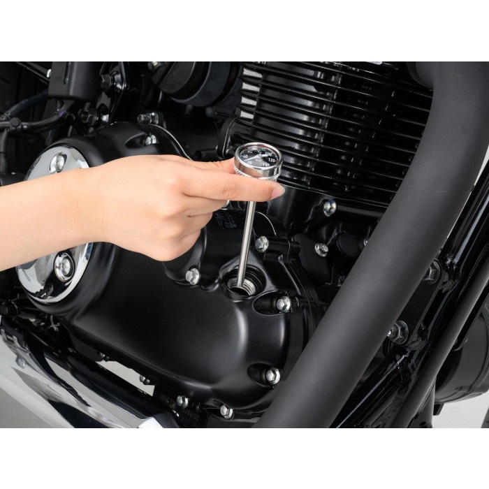 純正オイルフィラーキャップと交換して装着する、ディップスティックタイプの油温計。メーター内に封入したミネラルオイルは、文字盤の曇りを防ぐとともに、耐震性、耐熱性を発揮します。