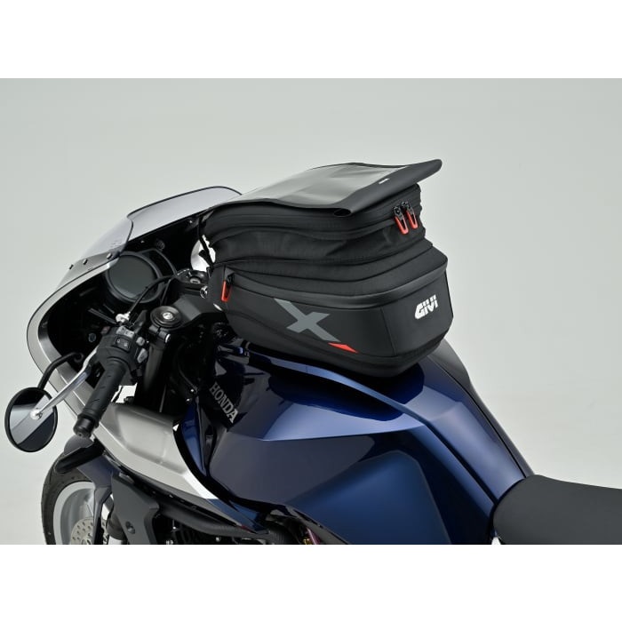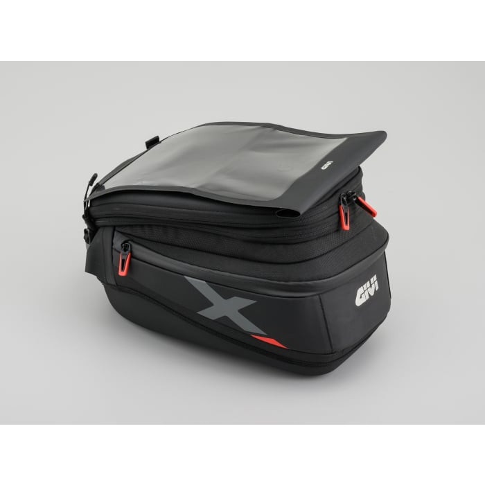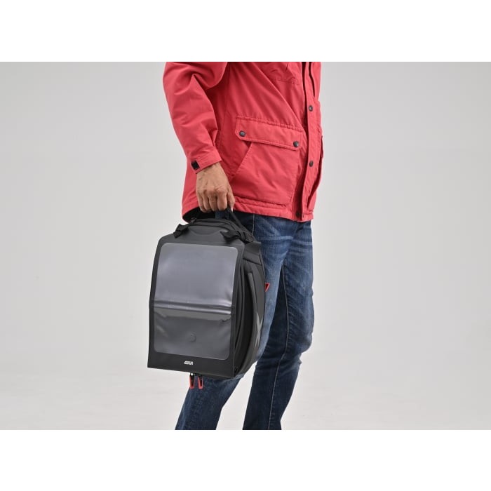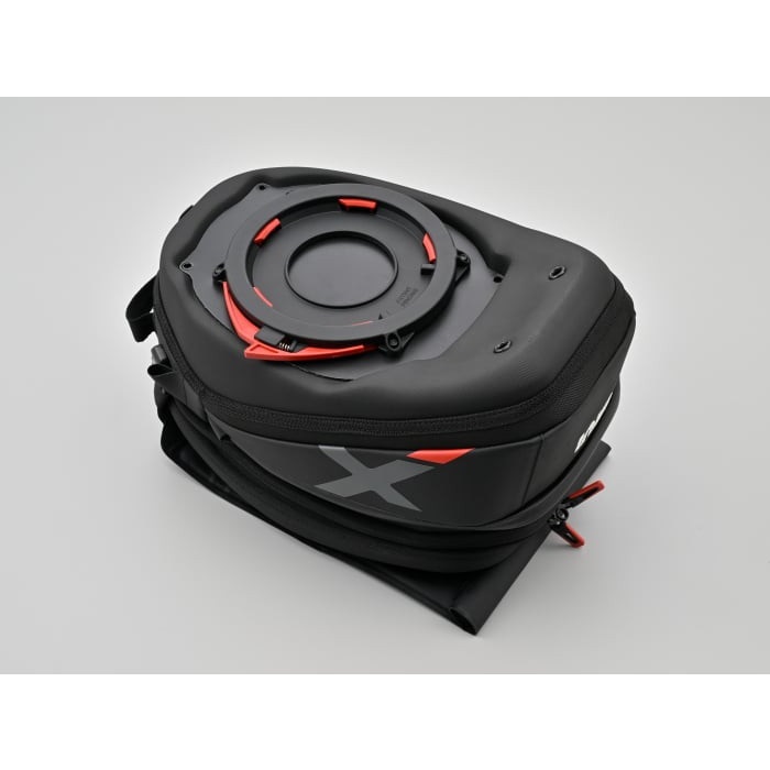 脱着可能な防水インナーバッグの二重構造で高い防水性(IPX5相当)を発揮。大容量ながらスタイリッシュなデザインで容量は15Lから20Lへ2段階拡張できます。タンクバッグ上面のタブレットポケットはワンタッチで脱着することができます。