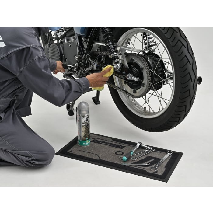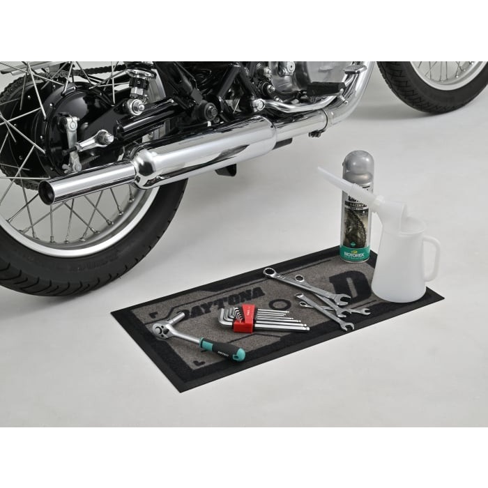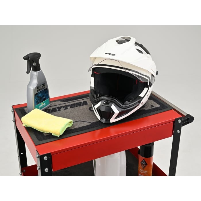ゴム素材のベースの上に耐久性の高いナイロン起毛を採用した、バイクの整備・保管に最適なメンテナンスマットです。ツールワゴンや作業台の上で使えば、小物が転がったり傷つかず便利。